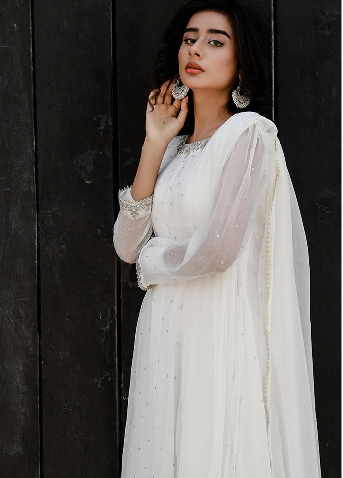 Meticulously handcrafted sitaara encrusted semi pure schiffon pishwas finished with light golden and silver dabka and badaam work on neckline and sleeves. Paired with same colour dupatta featuring samosa lace.