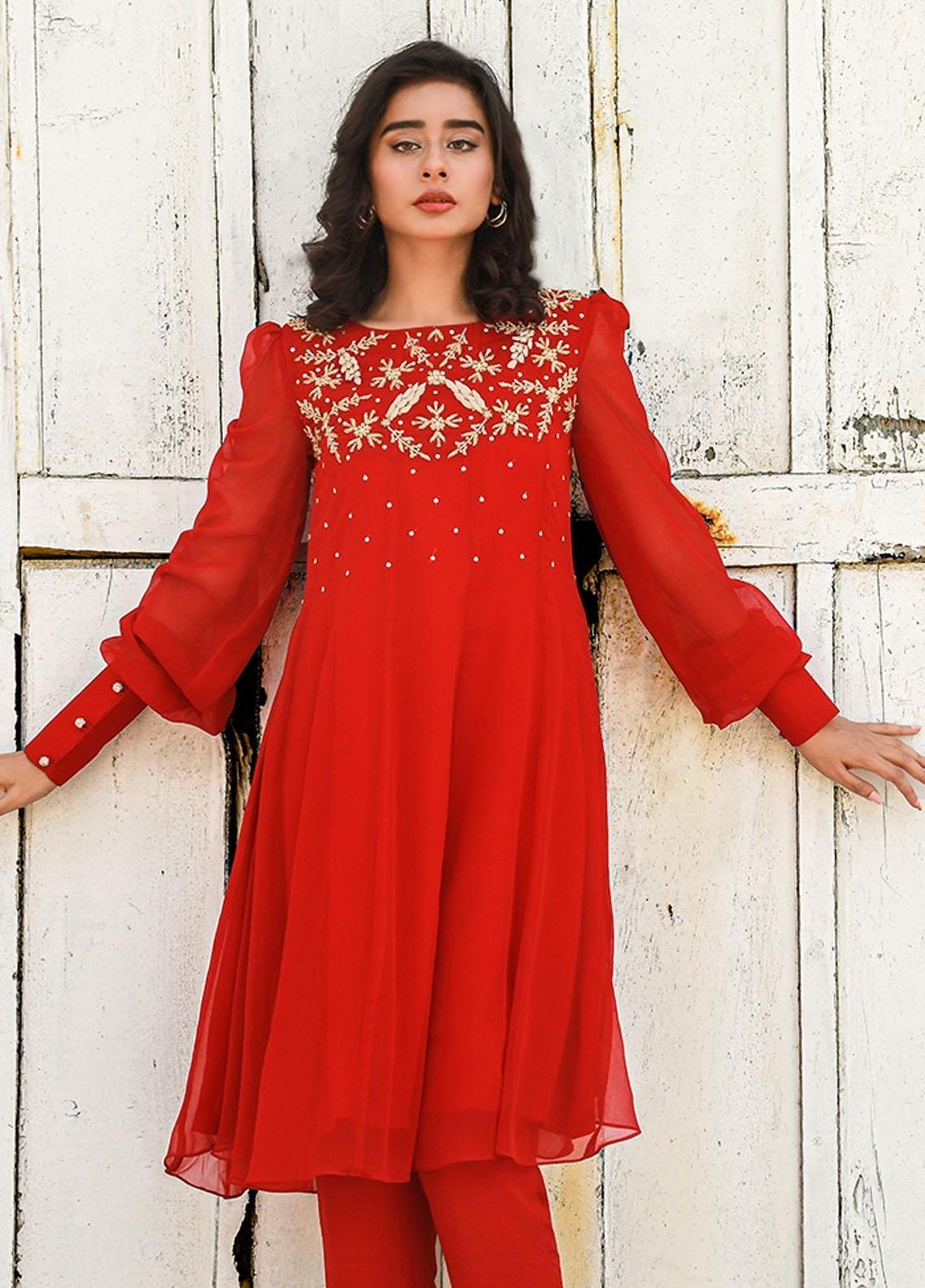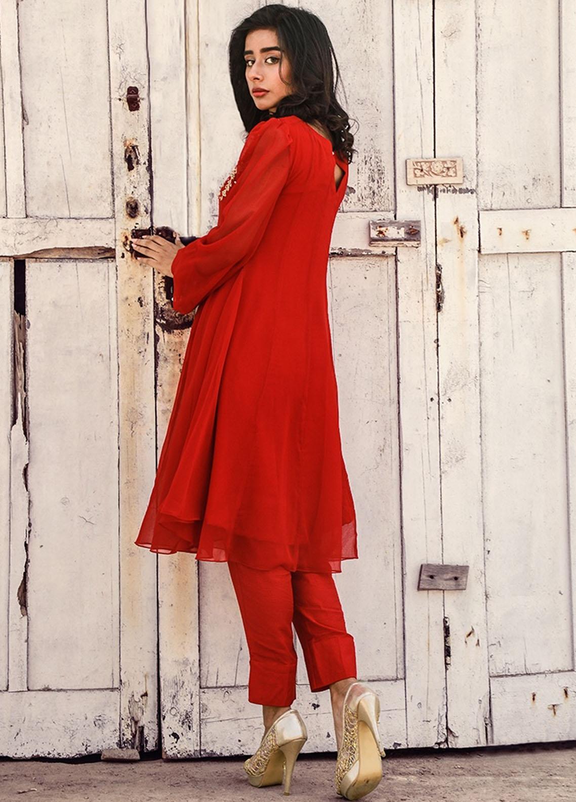 Crimson red pannelled kameez, intricately handcrafted with kora and dabka detailing adorned with organza folded flowers, featuring cuffs embellished with stone balls on jasmine sleeves._x005F