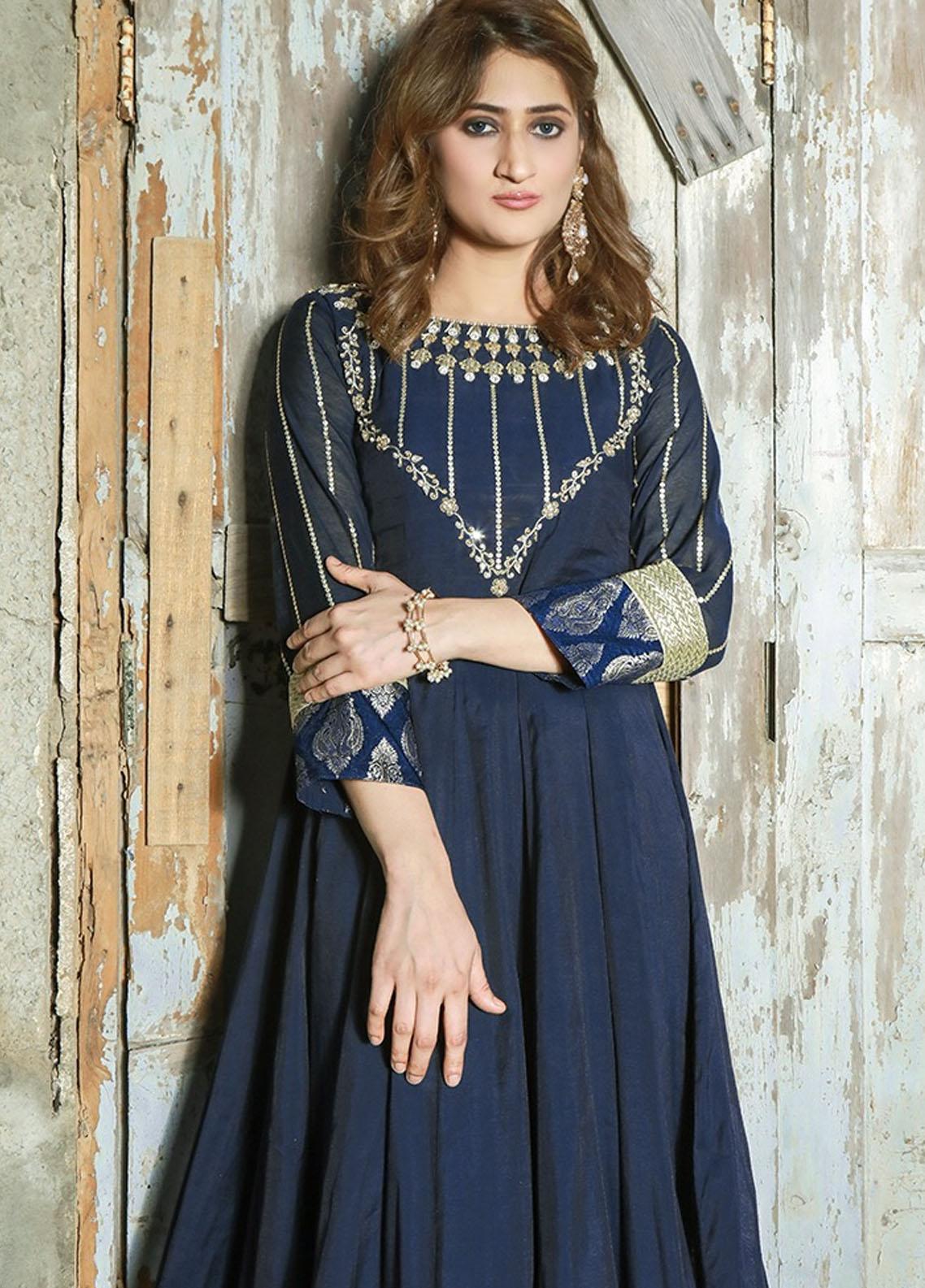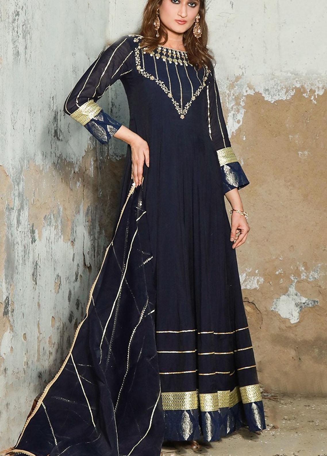Navy blue paper cotton frock with handwork of dabka, badaam and stones on the body and neckline, beautifully finished with jamawar and sequence lace on front and sleeves. Paired with organza duppata featuring sequence lace.