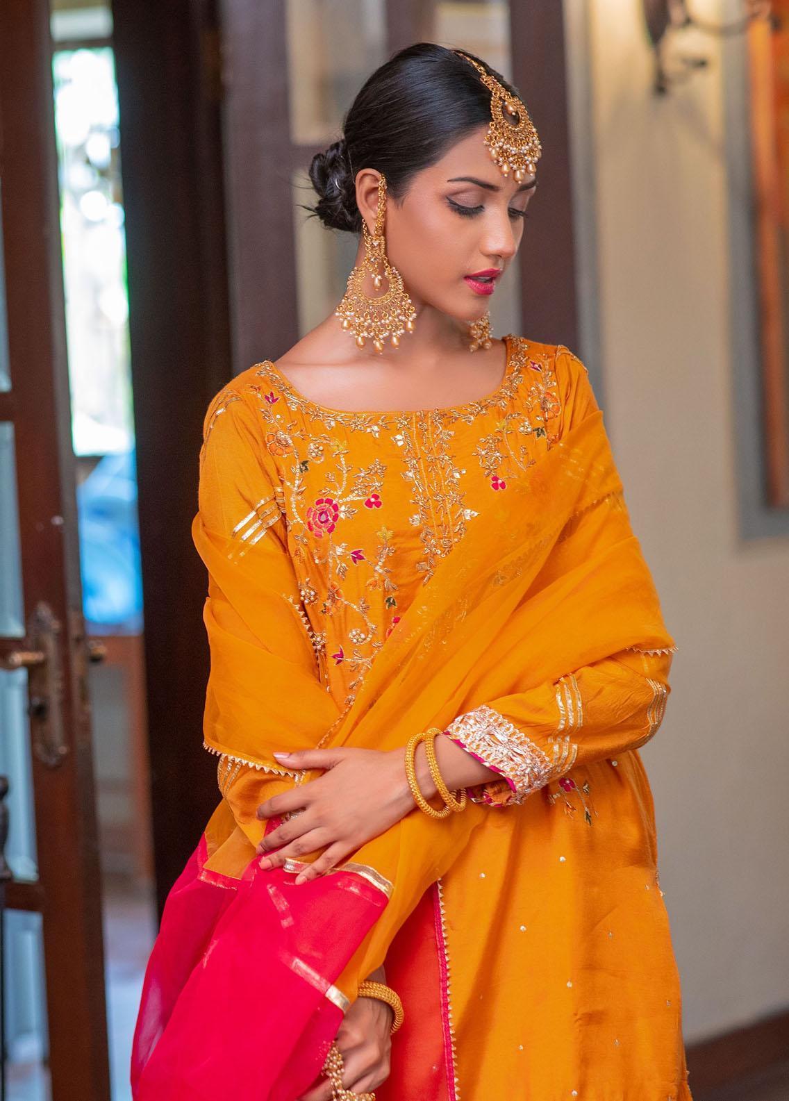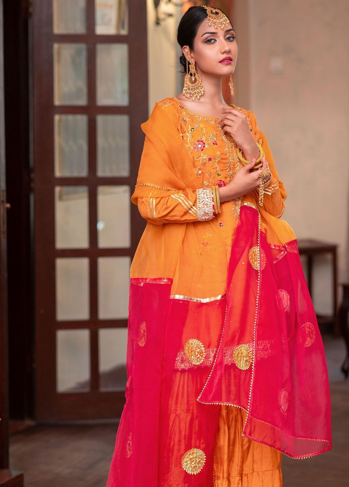 Crafted from luxurious Cotton Silk fabric. This short shirt and gharara outfit features intricate hand embellishments of dabka, gota, and resham work on the front body. The sleeves, daaman, and gharara are beautifully finished with Gota lace and Indian lace, adding an elegant touch. Complete with an Organza dupatta adorned with Gota lace finishing, this ensemble exudes timeless Eastern charm. Elevate your style with this captivating creation, designed to make a statement.