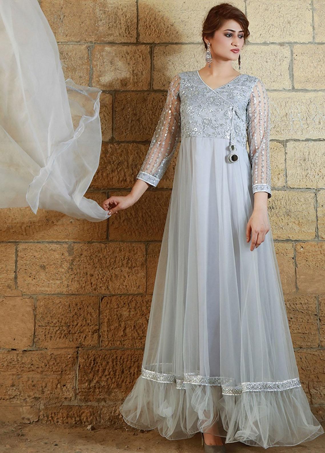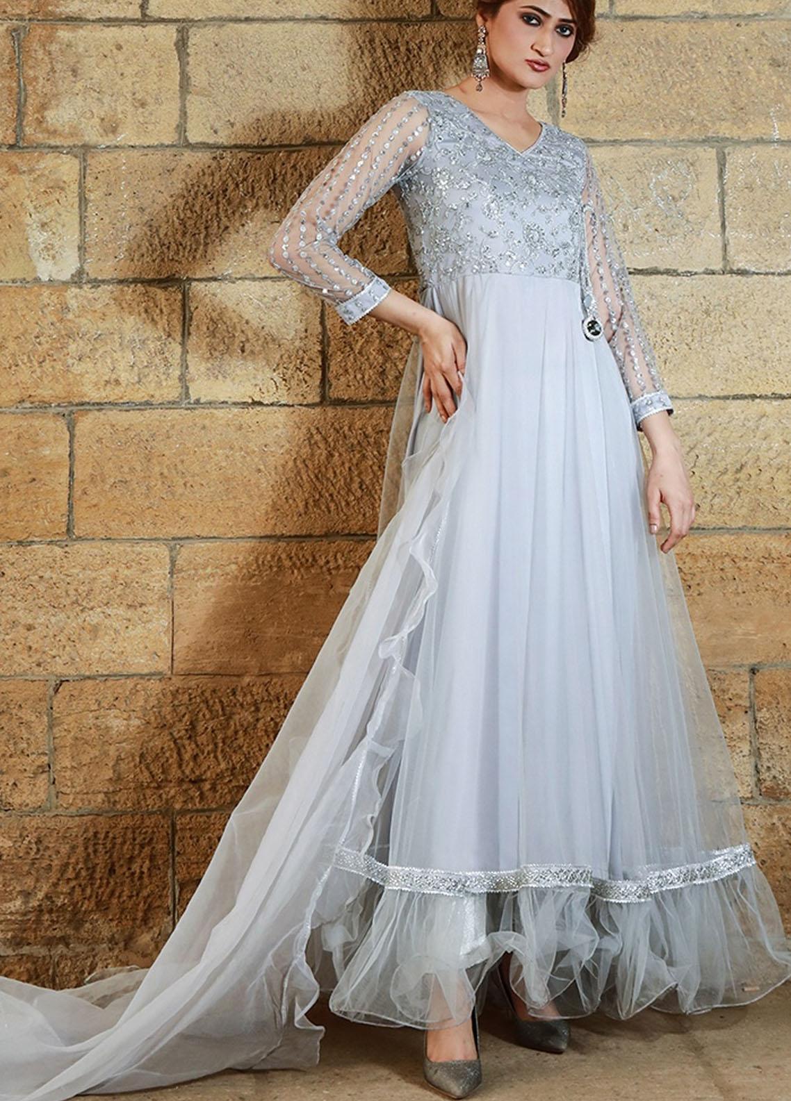 A grey net frock intricately handcrafted with silver zarii embroidery on body and sleeves, further elevated with tussle on neckline and silver kundan lace on hemline.