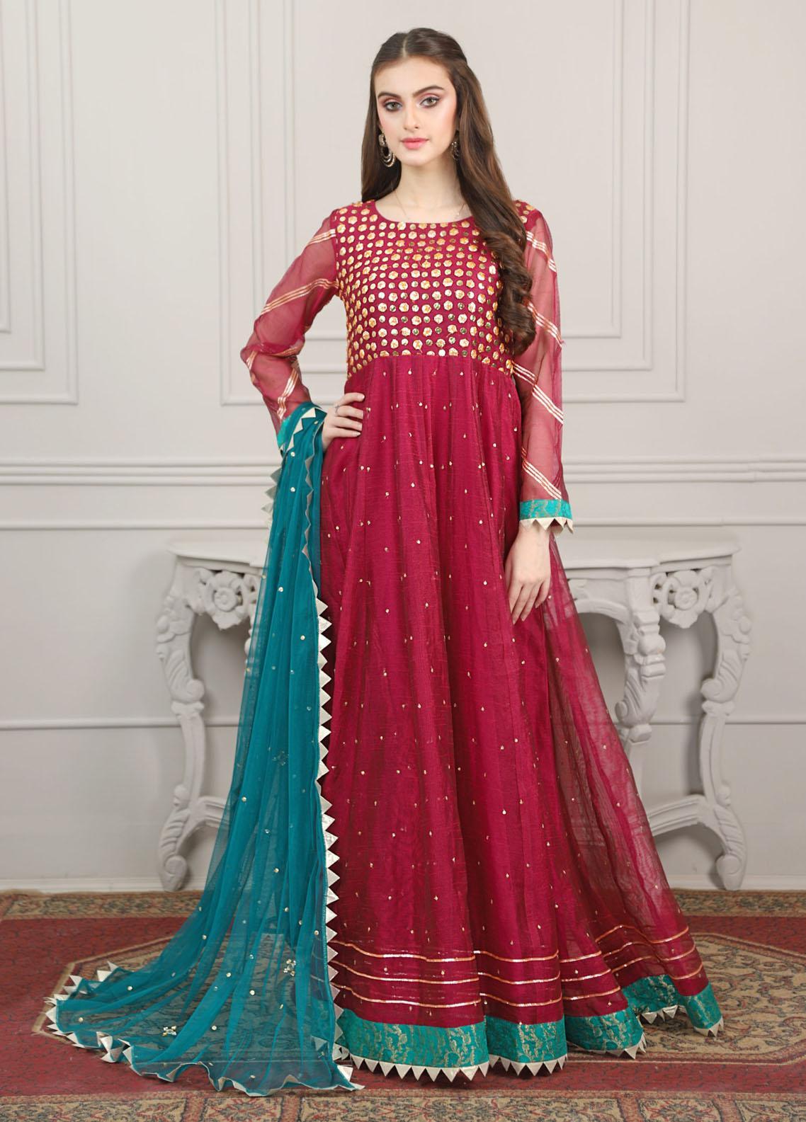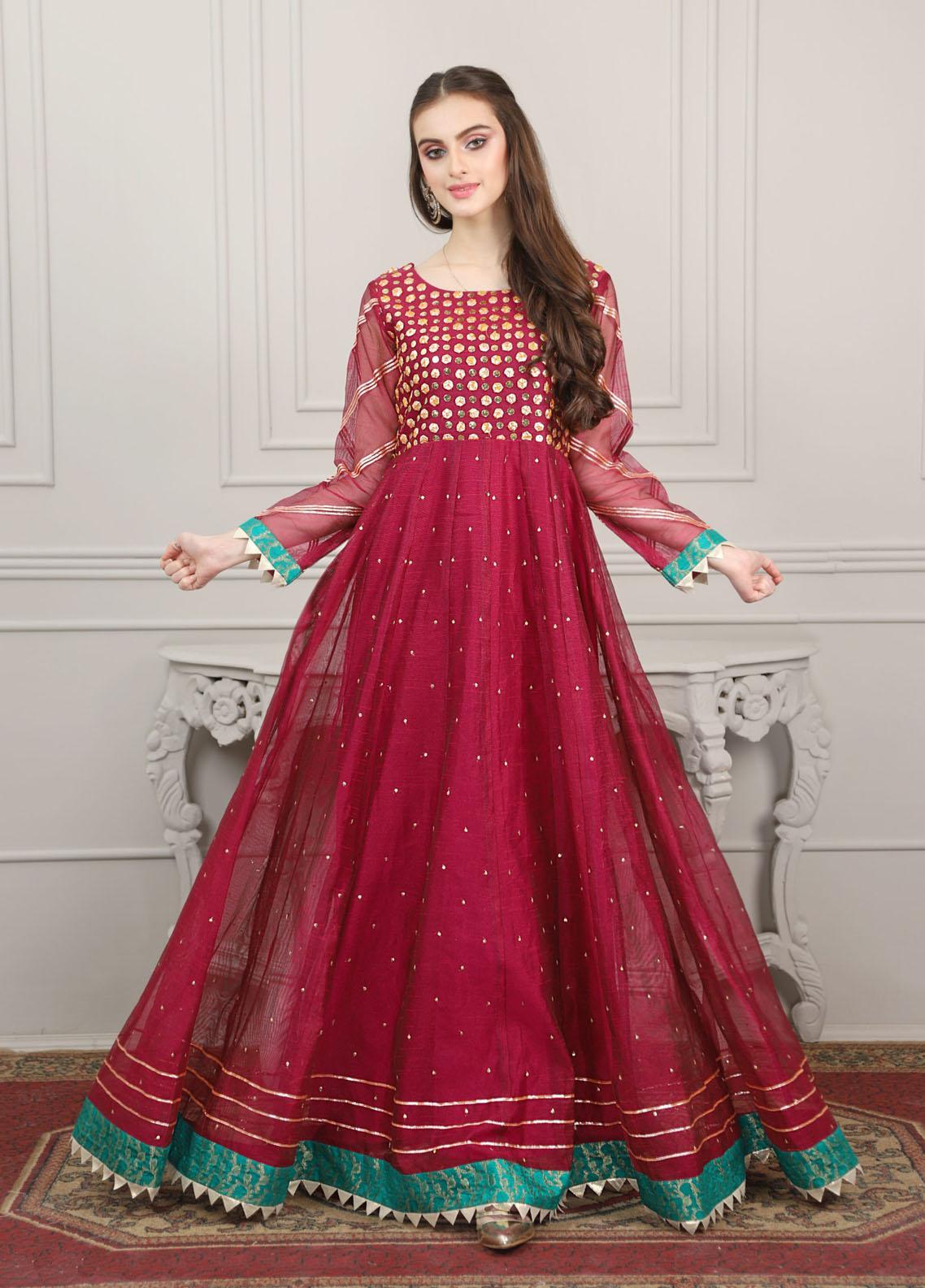 A fuchsia pink silk frock intricately handcrafted with mukaysh and gota work on body, sitaara embellishments on kali and hemline is beautifully finished with sea green jamawar and samosa lace._x005F