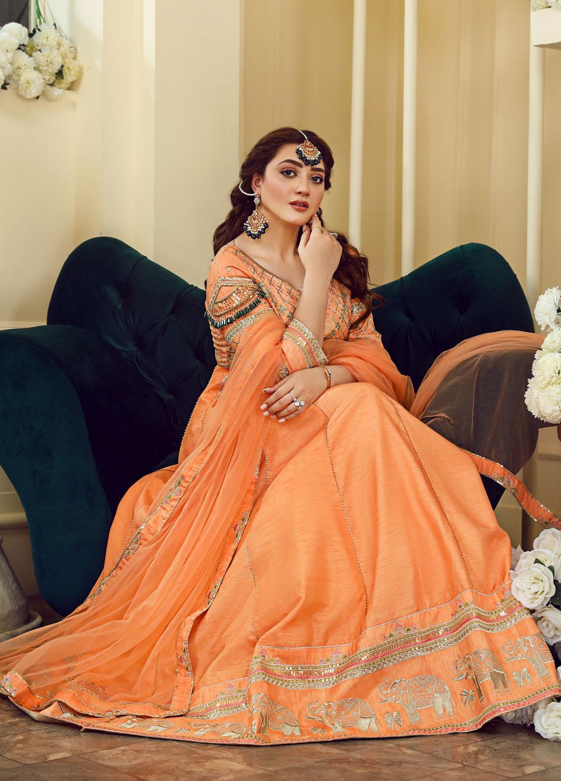 Peach raw silk kalidaar balanced off with heavily embroidered borders and embellished with tilla and dabka. it is paired with net dupatta four side borders on it.