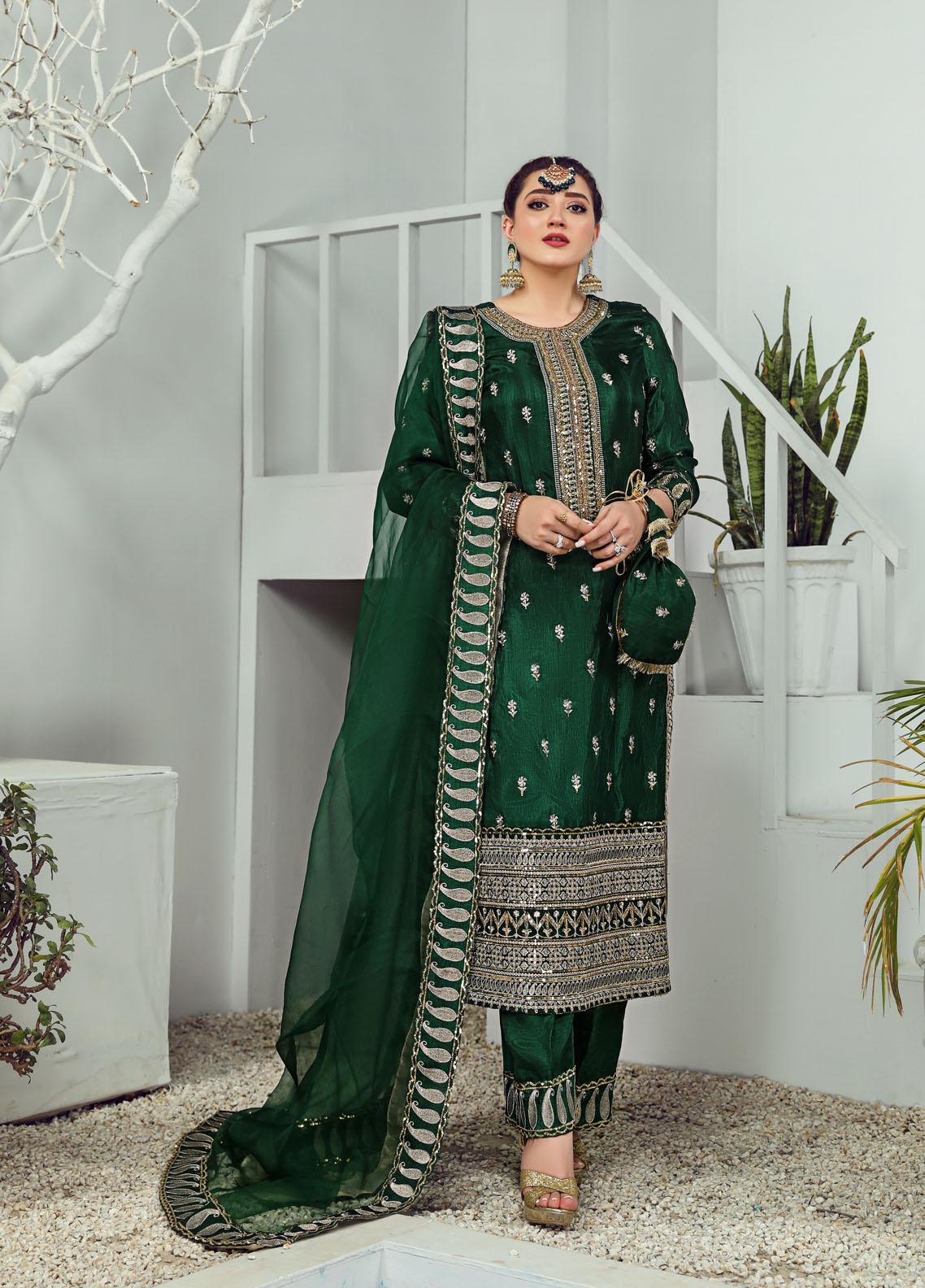 This bottle green embroidered kameez and trouser set is a quintessential piece for easy sophistication. Its organza dupatta perfectly elevates the outfit with a tilla or threadwork border.