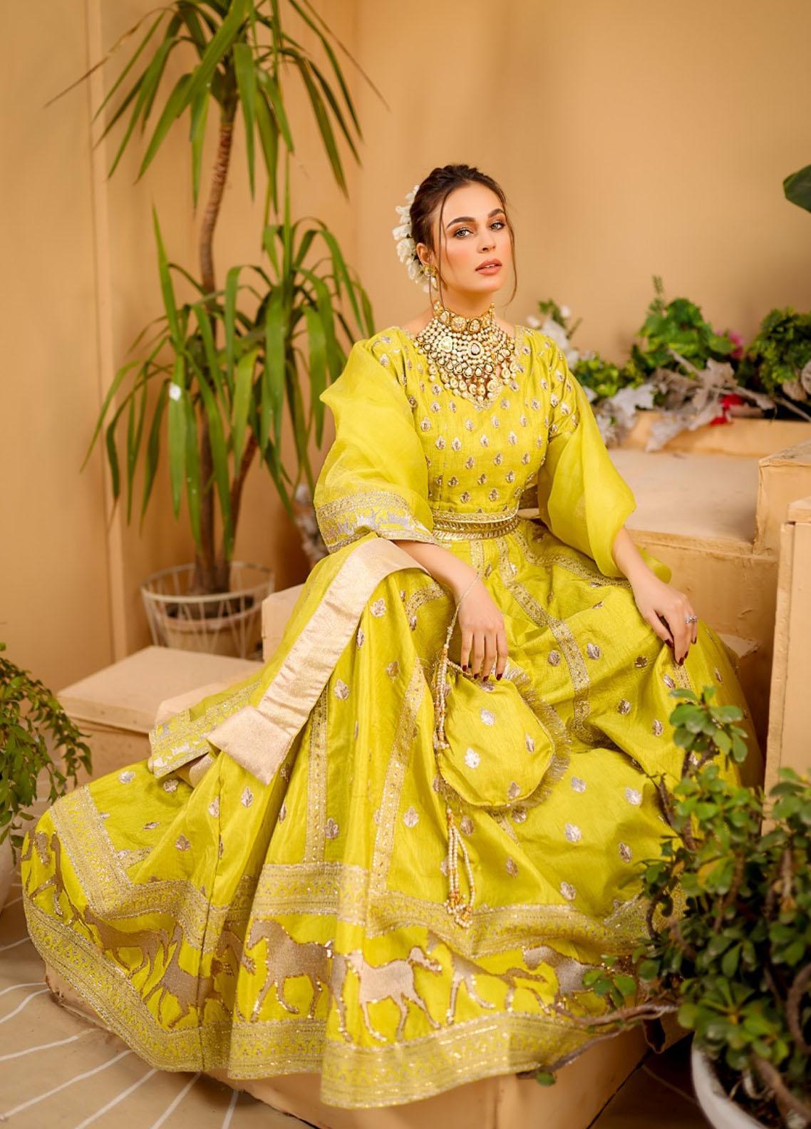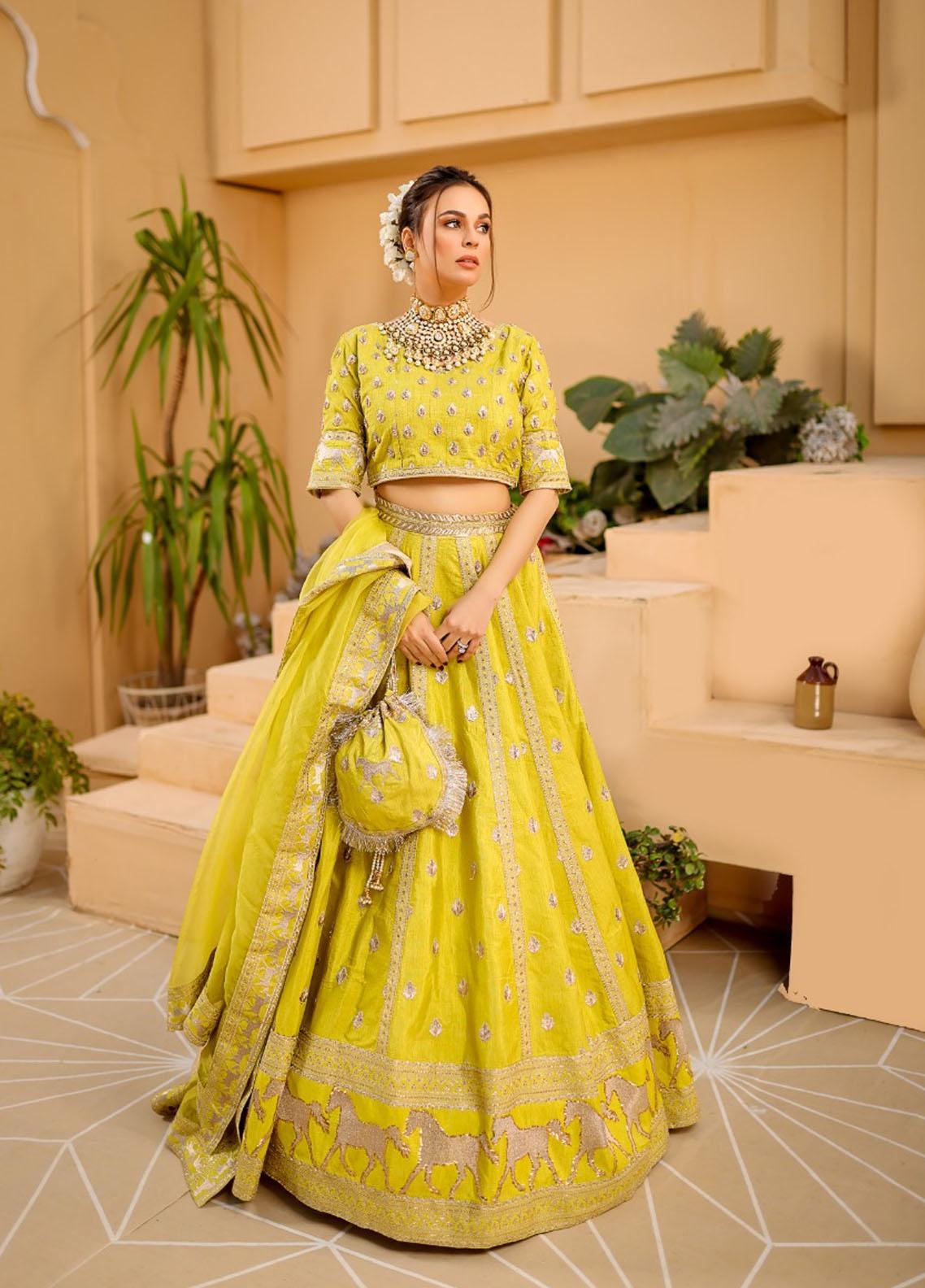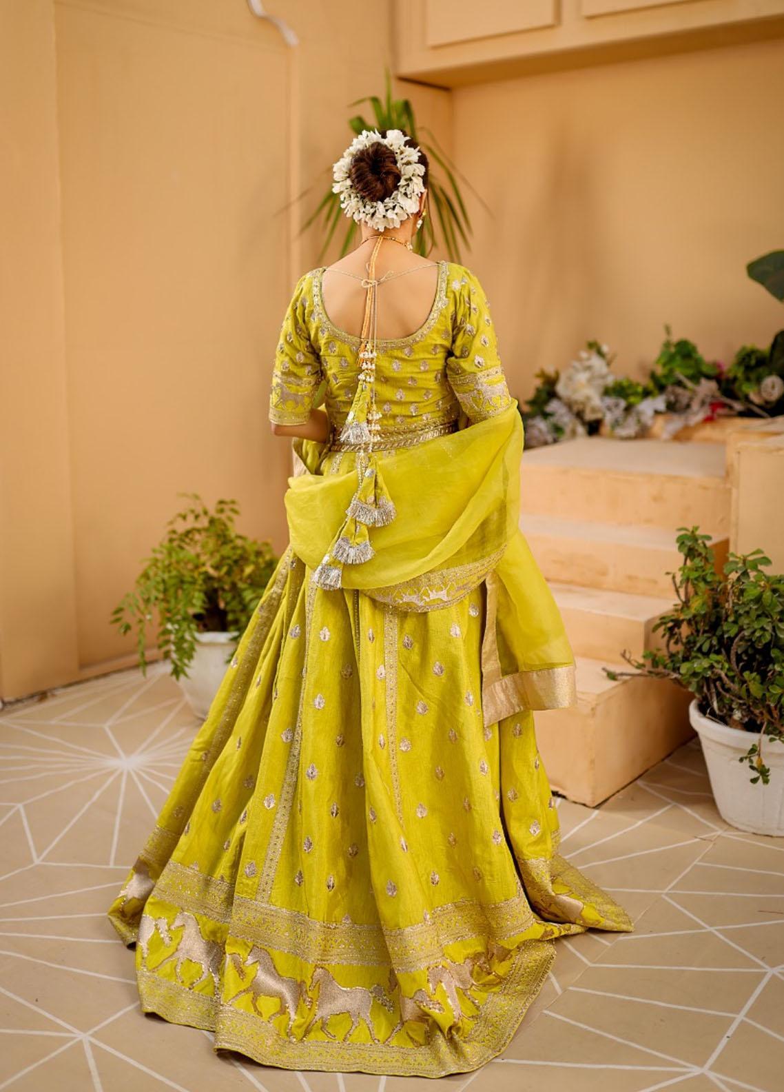 Kohinoor is beautifully rendered on Raw silk, with a silhouette of lehenga choli. Kohinoor embellished with sequins dabka tilla. The outfit is perfectly paired with organza dupatta, with all four sided embellished borders.