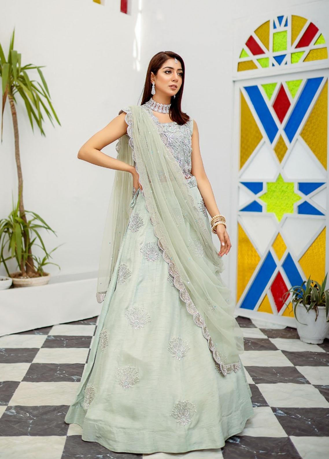 This pistachio raw silk lehenga embellished in pearls, dabka sequins, salma. Paired with embellished choli, completing the look with ruffled dupatta.