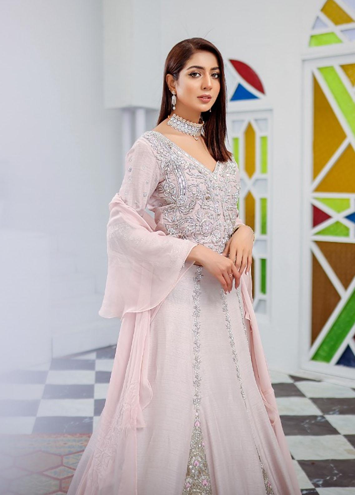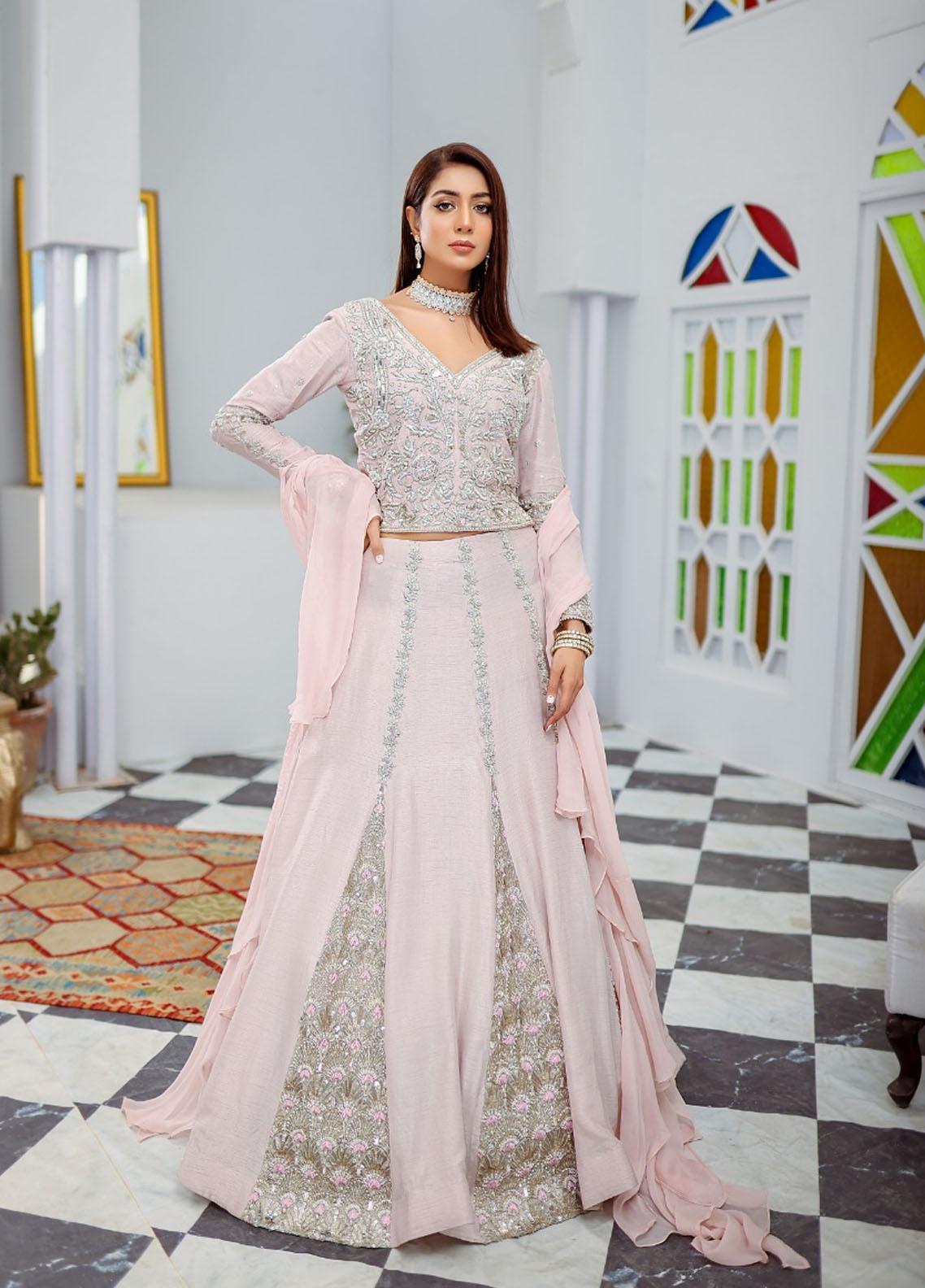 Pink raw silk lehenga choli is emberoided with silver pipe work, dabka, naqshi stones and tilla. Completing the look with shaffon ruffle dupatta.