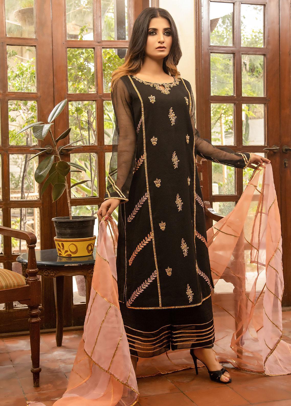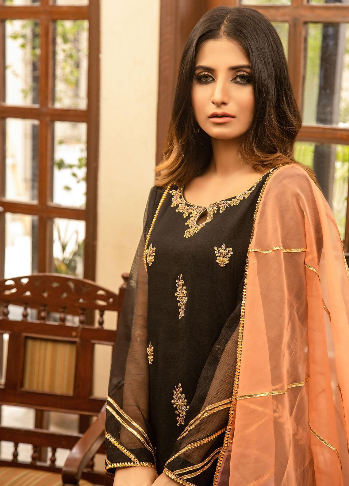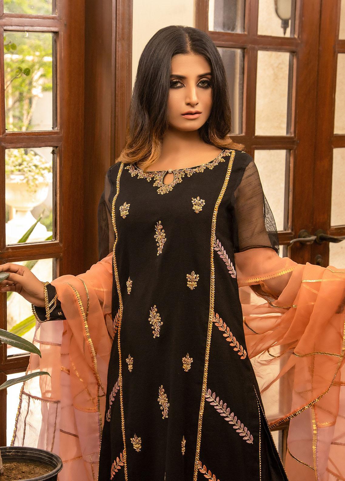 A perfect black long shirt made with khaddi net fabric featuring intricate handwork of gold dabka with resham and stone work on front & zari embroidery on side panels enhanced with kundan, gota and mini samosa lace.
