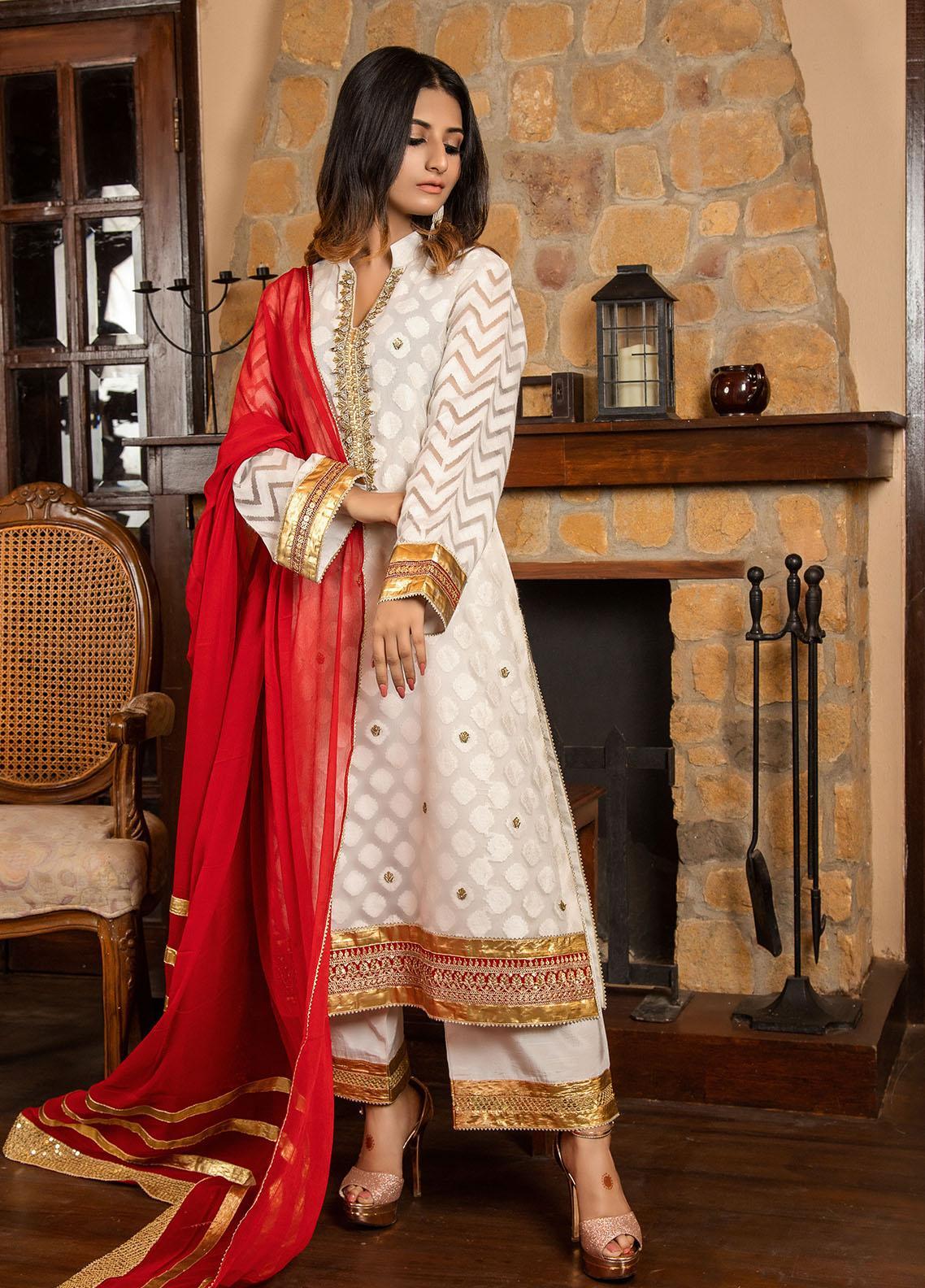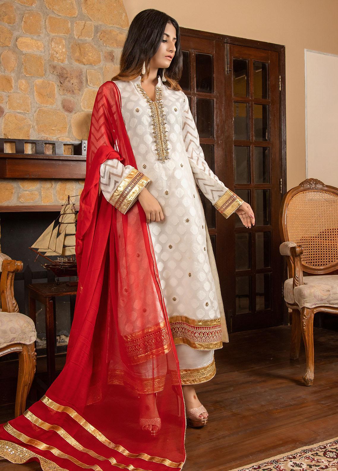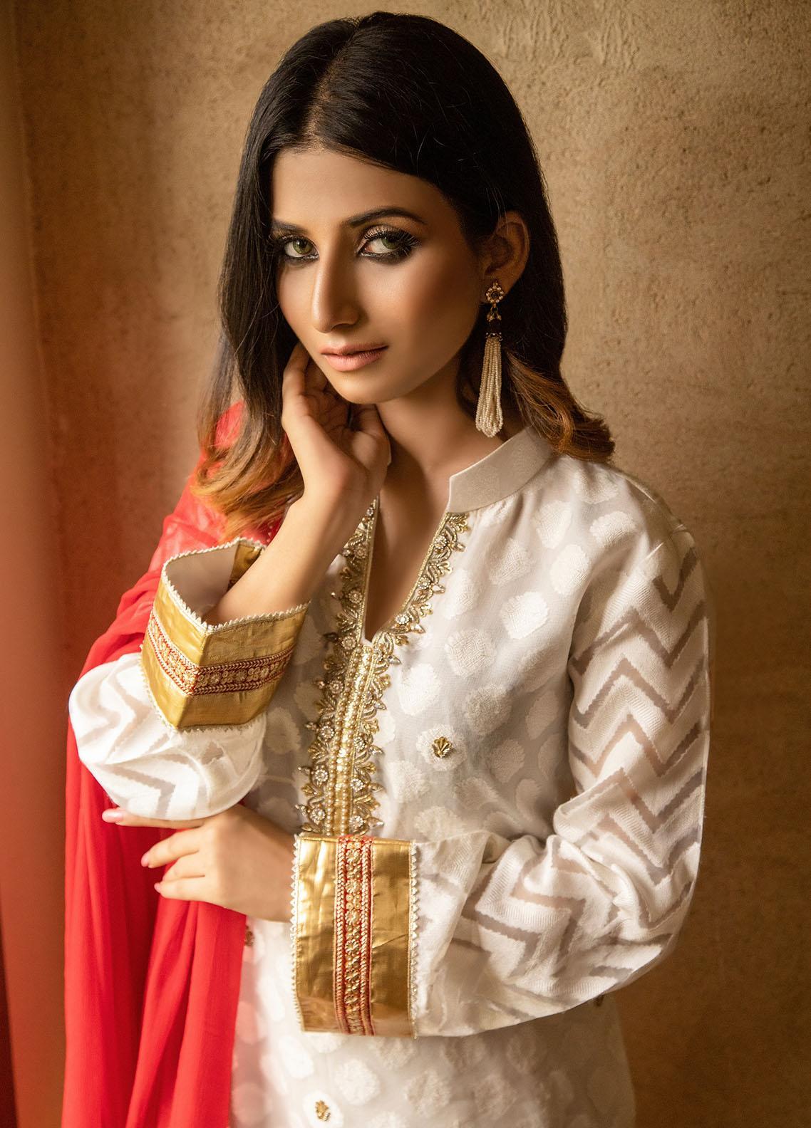 White self organza long shirt exquisitely adorned with embellishments on neckline. Neckline is encrusted with pearls, stones, kora and dabka hand work. Further, hem border is finished with maroon sequence and gota lace.