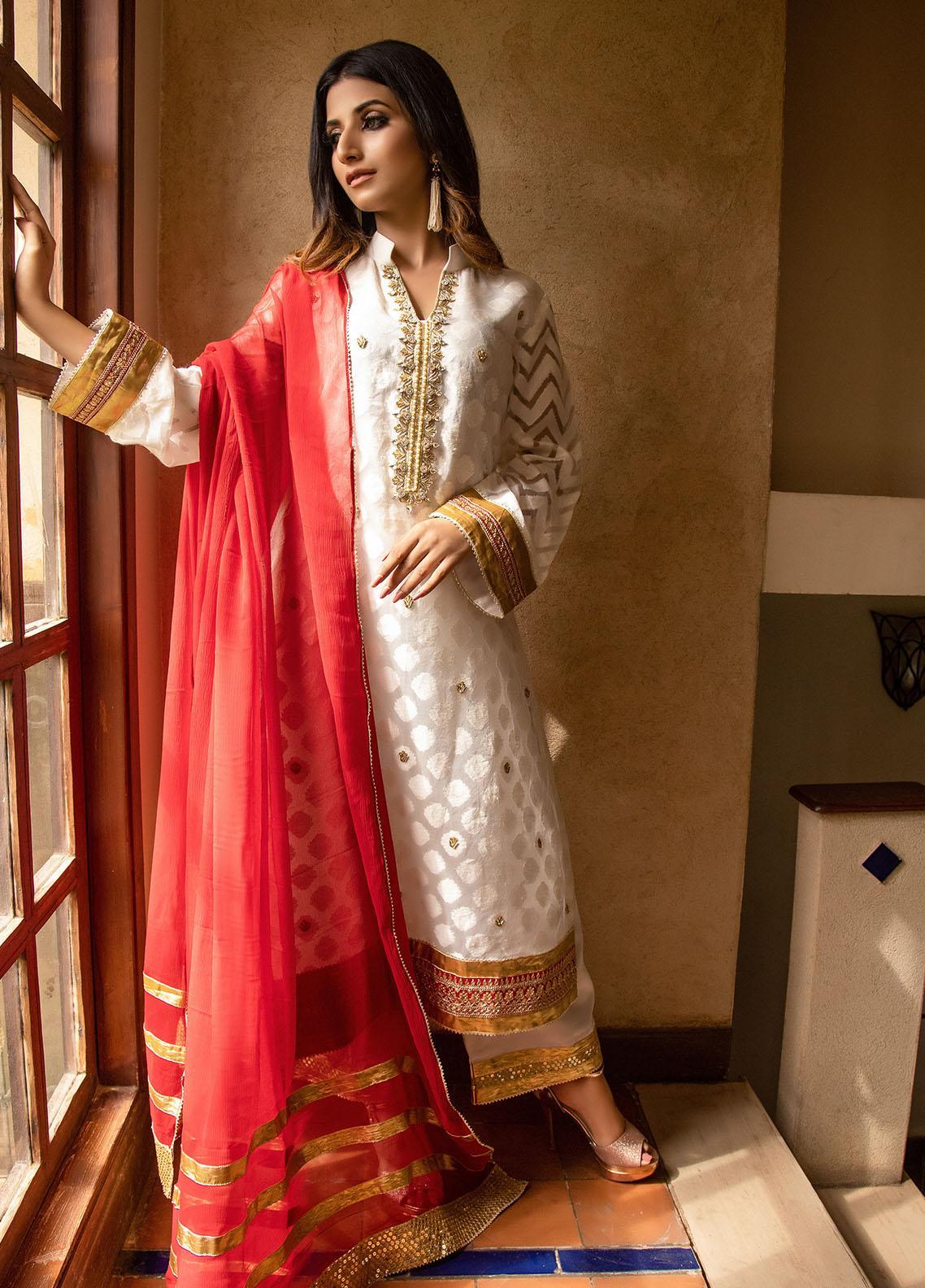 Paired with raw silk trouser and schiffon dupatta featuring gota and sequence lace.