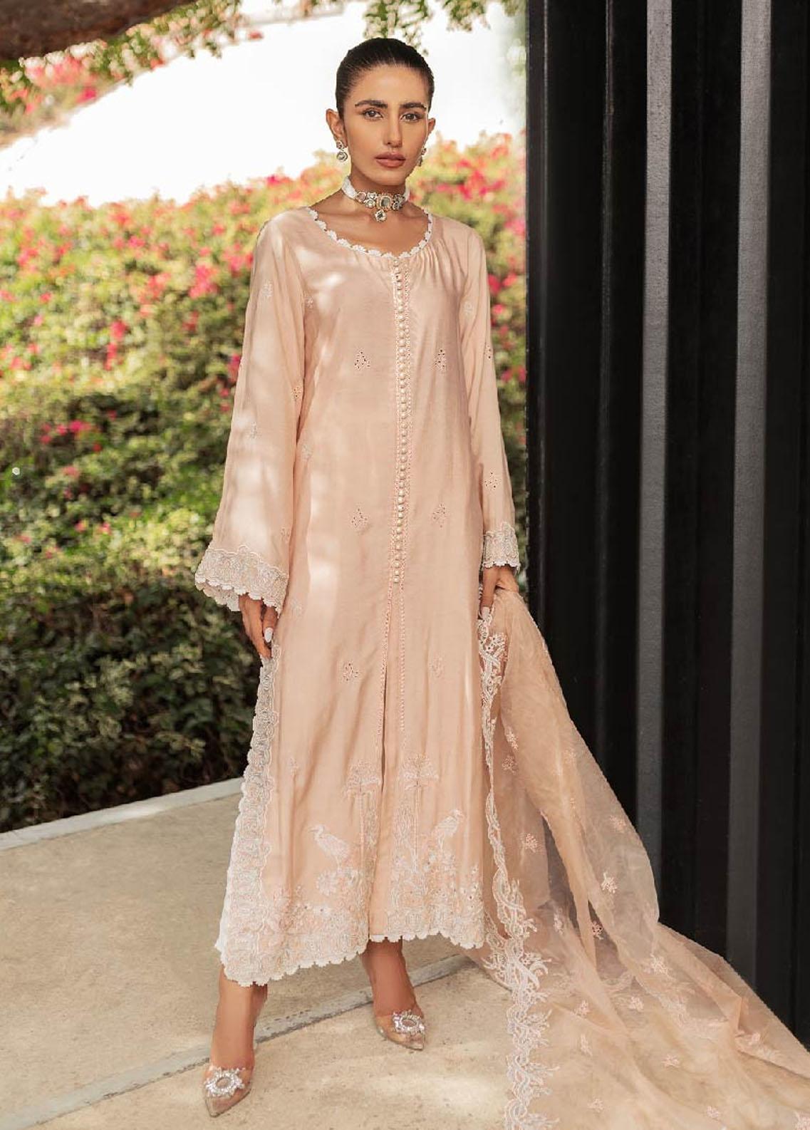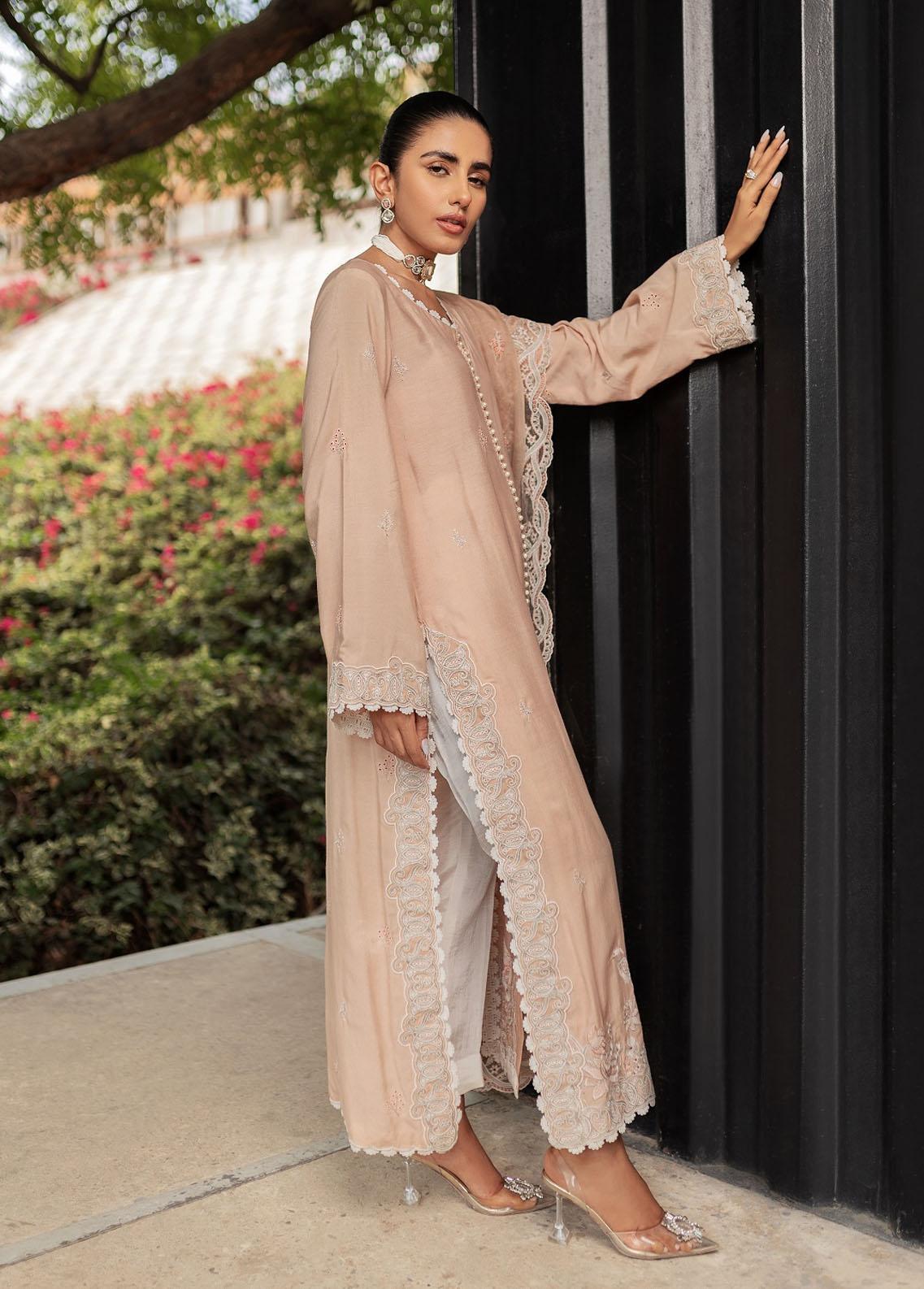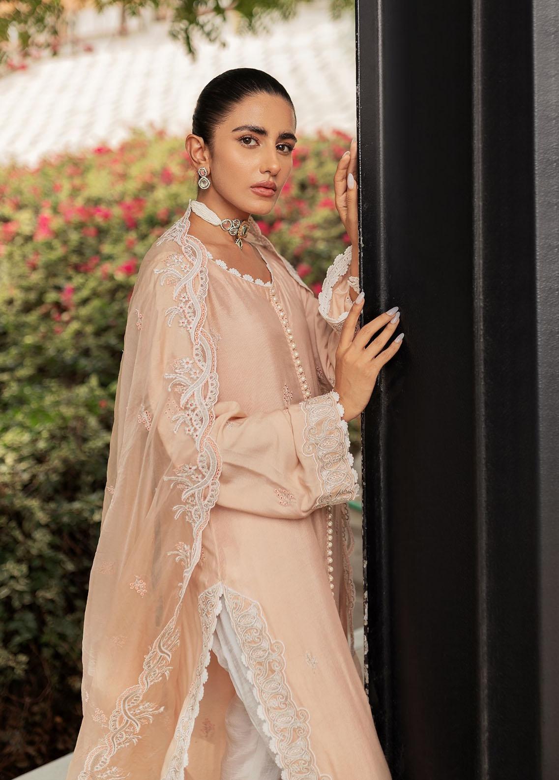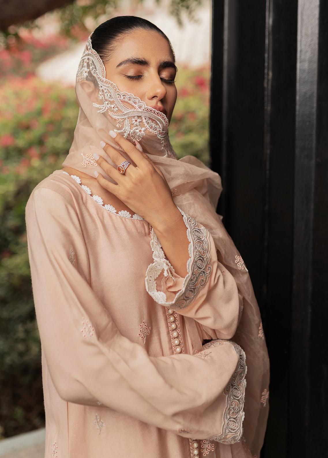 little boat is artfully illustrate with striking floral blooms in the captivating shade of blush pink.the embroided shade accentuated with an embose embroidery on the daman with front open style paired with organza dupatta and contrass raw silk trouser.