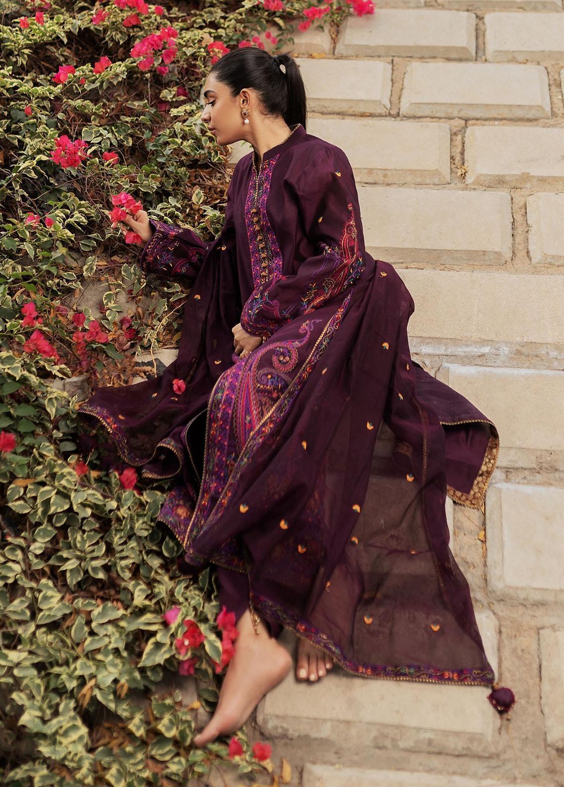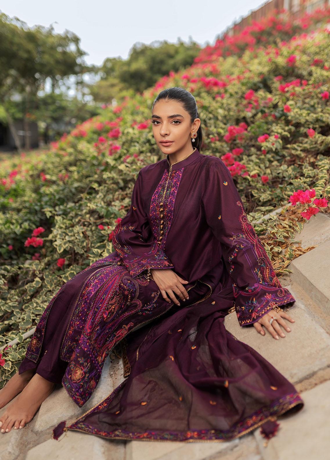 a purple bumper net shirt is artfully detailed with paisley kangari lace used, floral motifs used in itwith hand tassels made on sleeves.