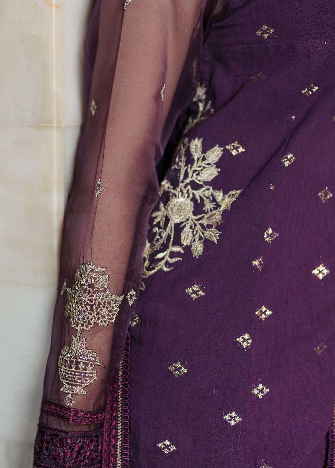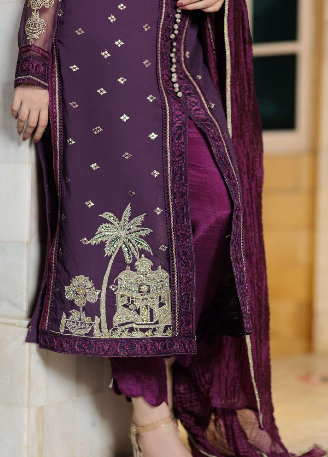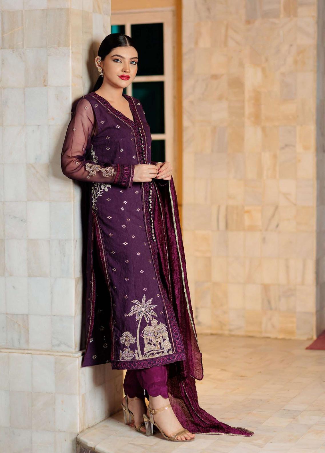 a grape purple silhoutte with blend of mughal embroideries siwth straight sleeves with touch of gold tilla and zari. This smoldering design is a chick look for evening alike
