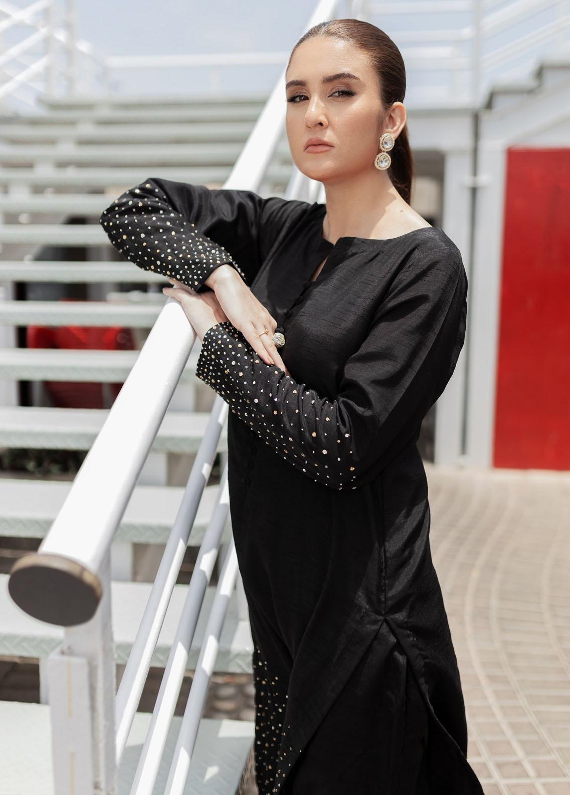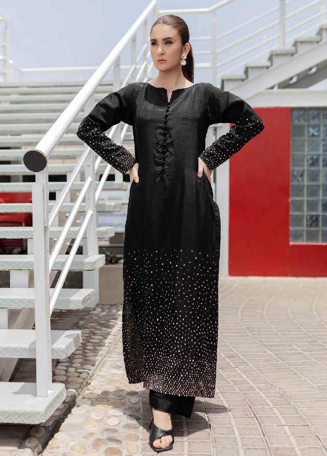 an exquisitely ornamented ensemble of gold and silver shimmering details beautifully crafted with hand on black raw silk canvas. Gorgeously hand emblisheddetails make it an eye catching piece and a statement on it.