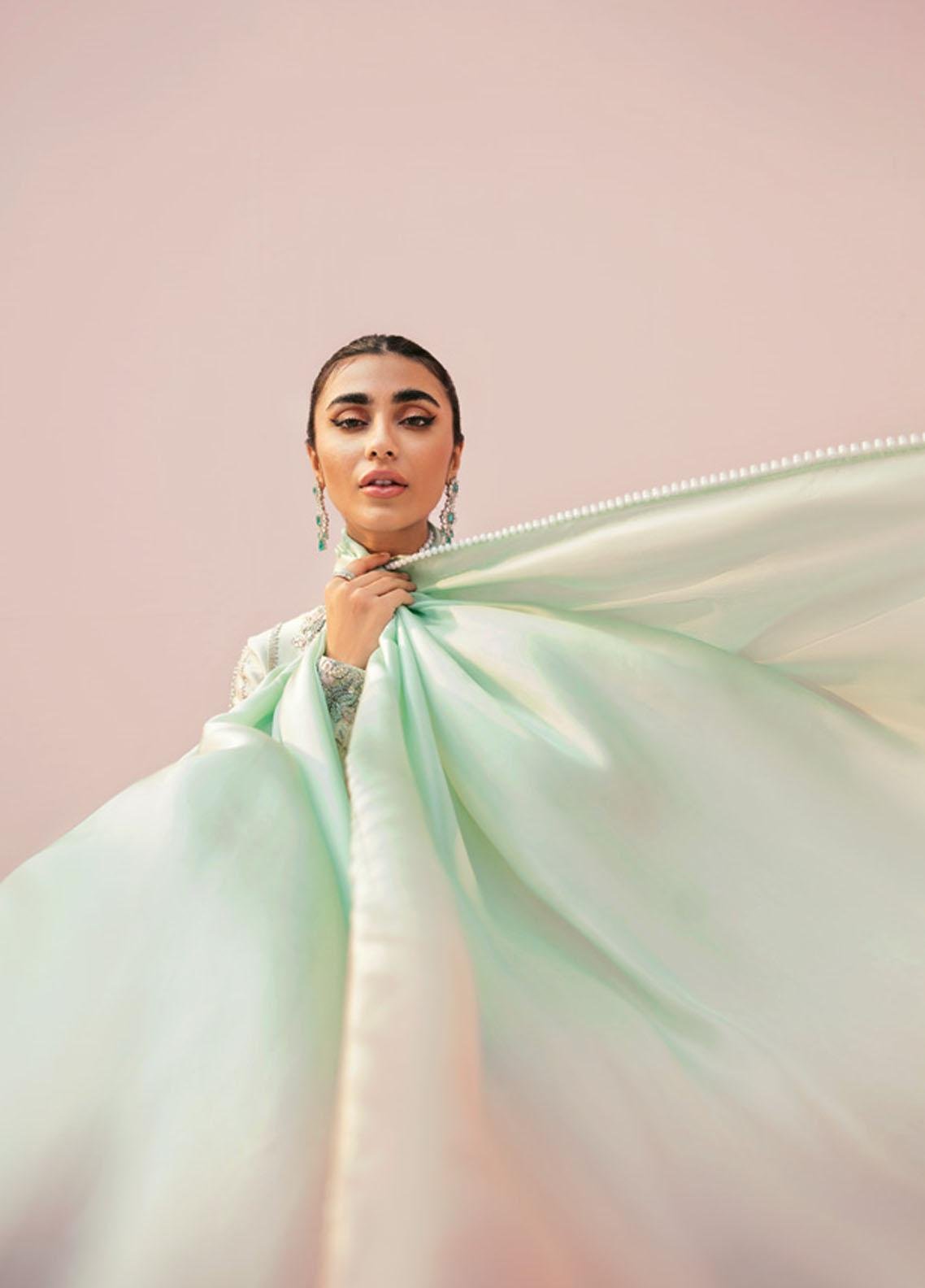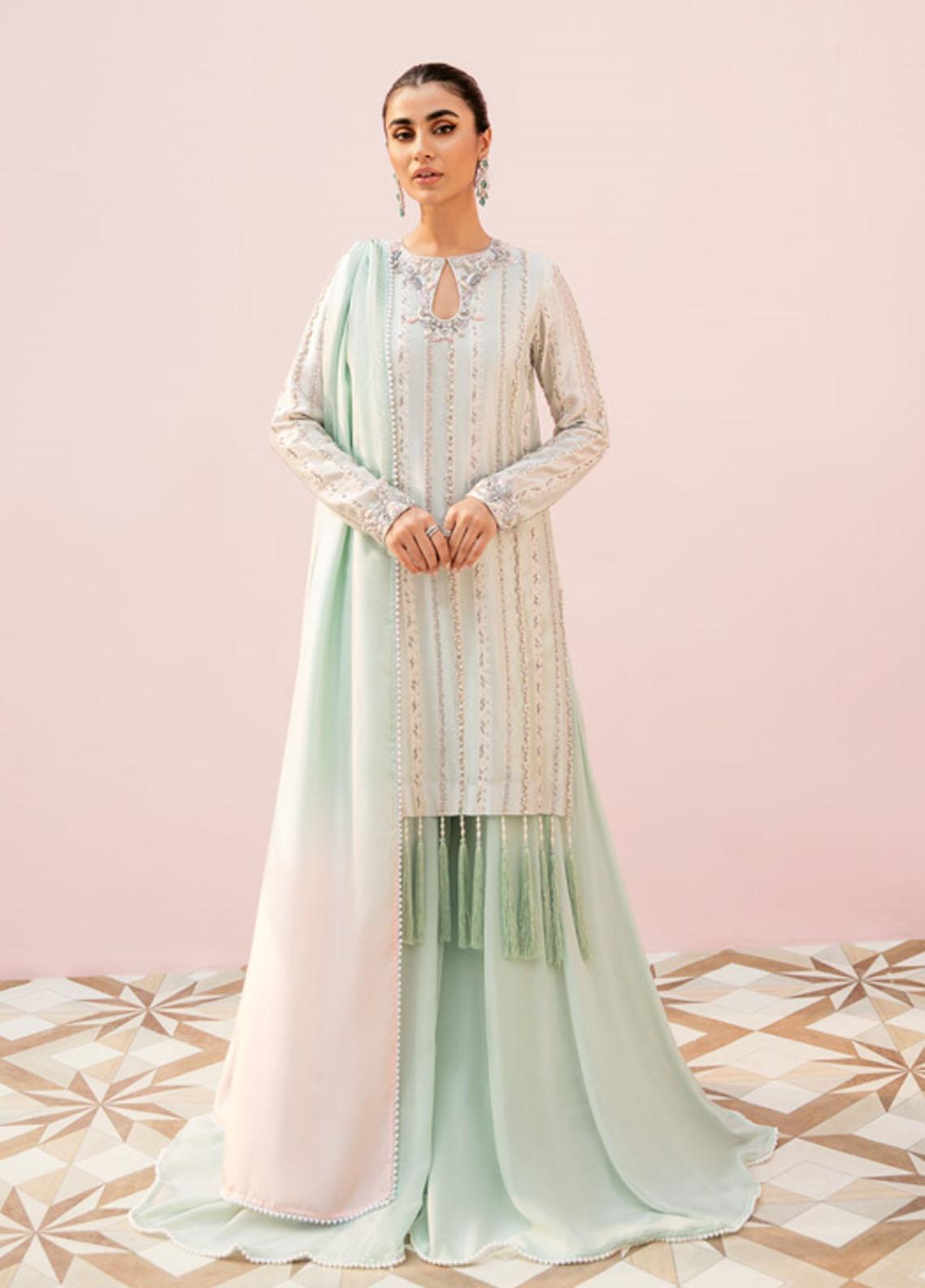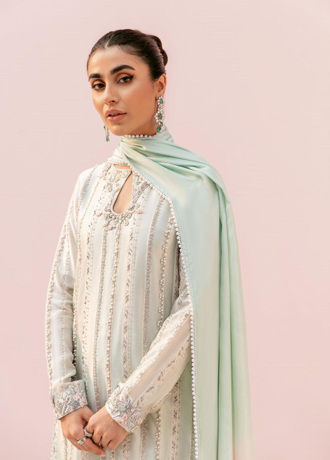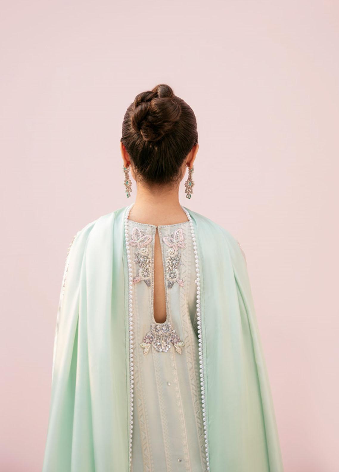 Luxury Pret 3 Piece Wedding Dress-This mint green shirt features intricate silver work on the front and back neck. The neckline accentuates its splendor and makes it absolutely gorgeous. It is further enhanced by the coral detailing on the sleeve. It is paired with a flowy sharara and a tie dye silk dupatta with pearl finishing.