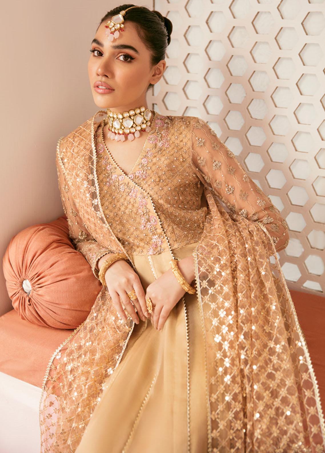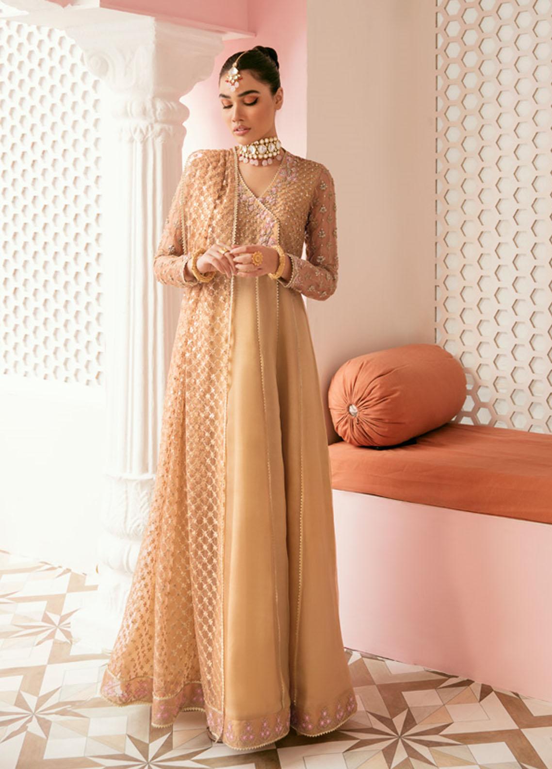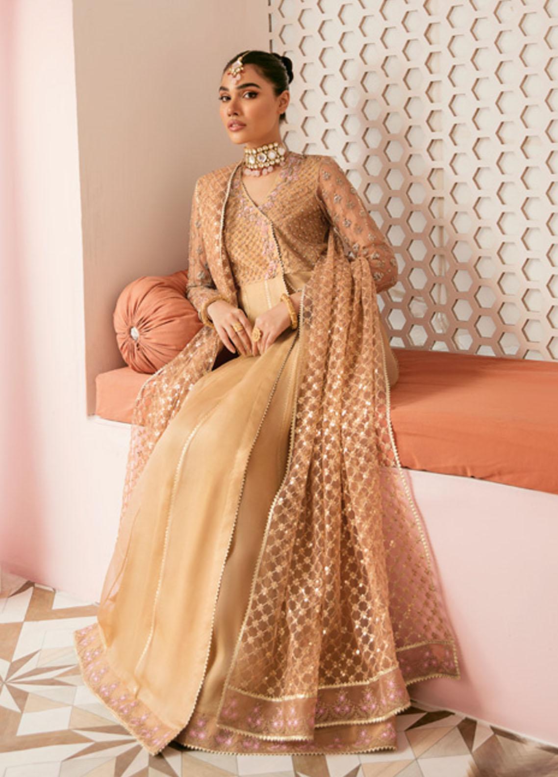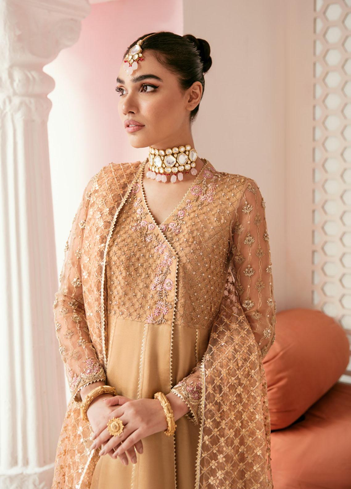 Luxury Pret 3 Piece Wedding Dress-: This beige-gold pure organza angrakha exudes elegance and timeless beauty. The ensemble comprises a meticulously hand crafted bodice & sleeves in contrasting hue of pink. The panels feature kingri detailing. It is paired with a regal dupatta featuring sequin and tilla details.
