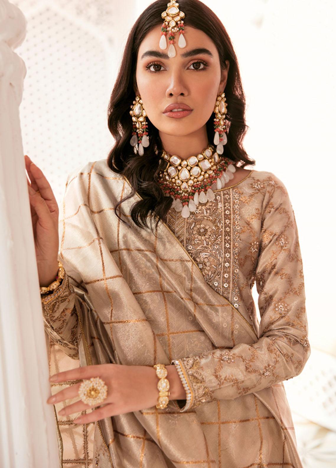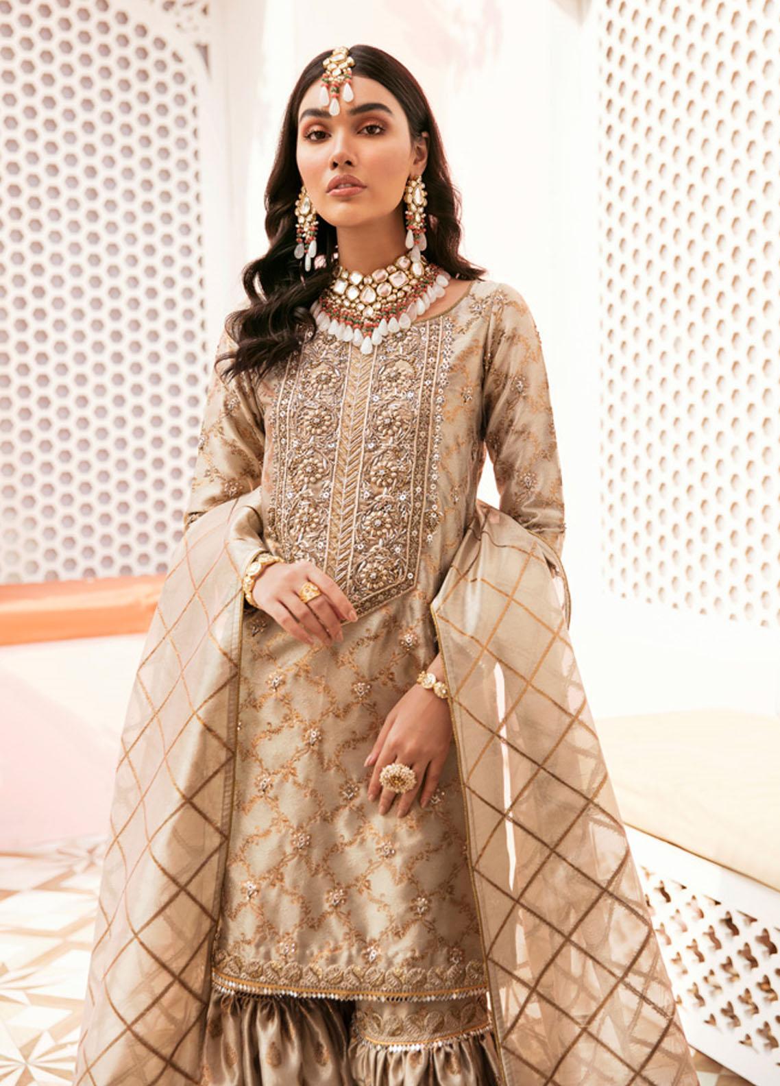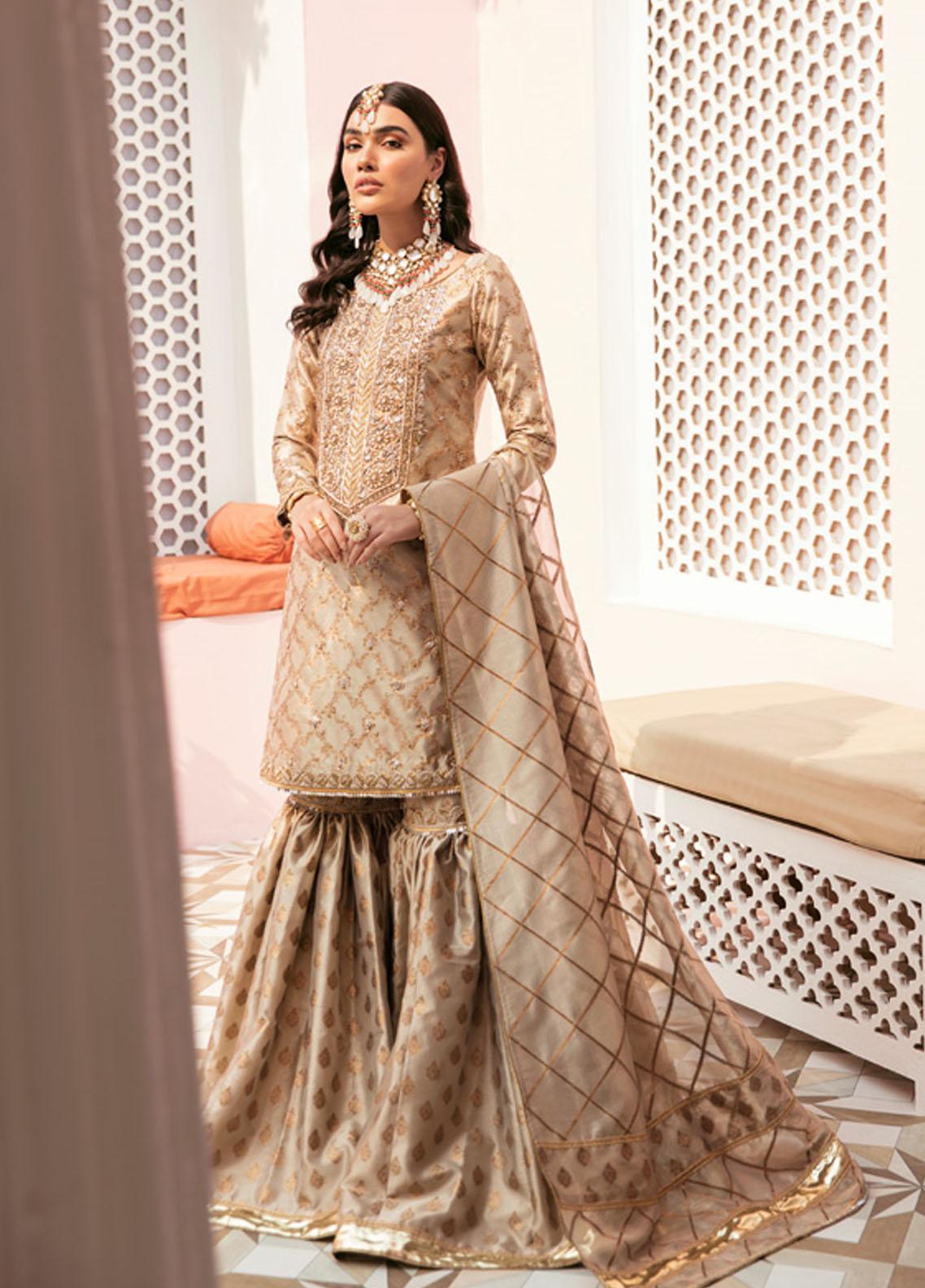 Luxury Pret 3 Piece Wedding Dress-This copper gold traditional attire features intricate work on the neckline and daaman, the spray adds allure to it. It is paired with a jamawar tissue gharara featuring hand work on the goat and a criss cross patterned self tissue dupatta.