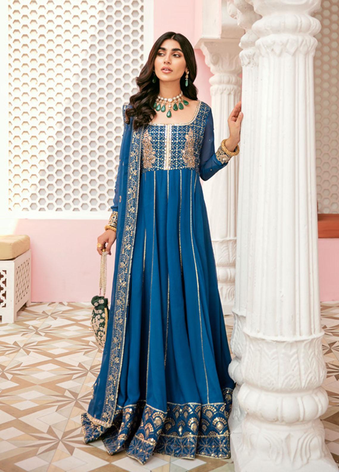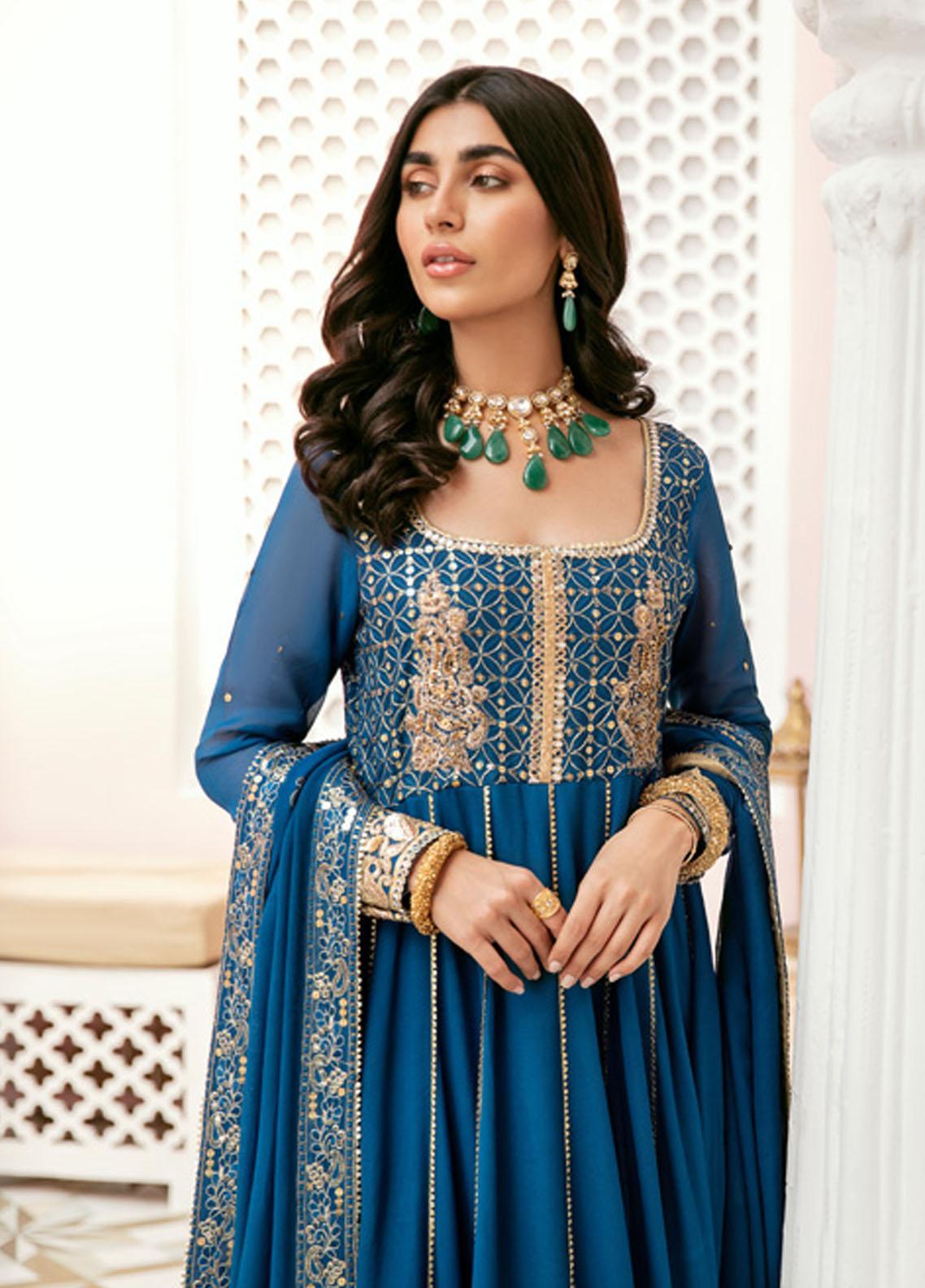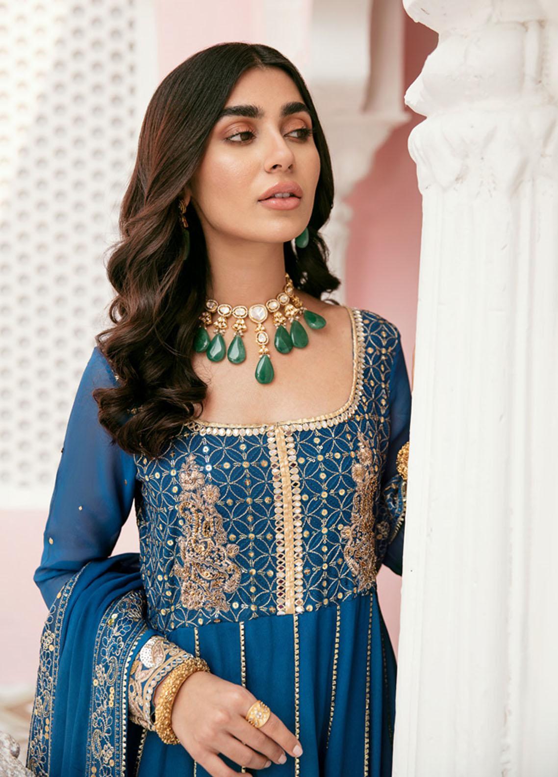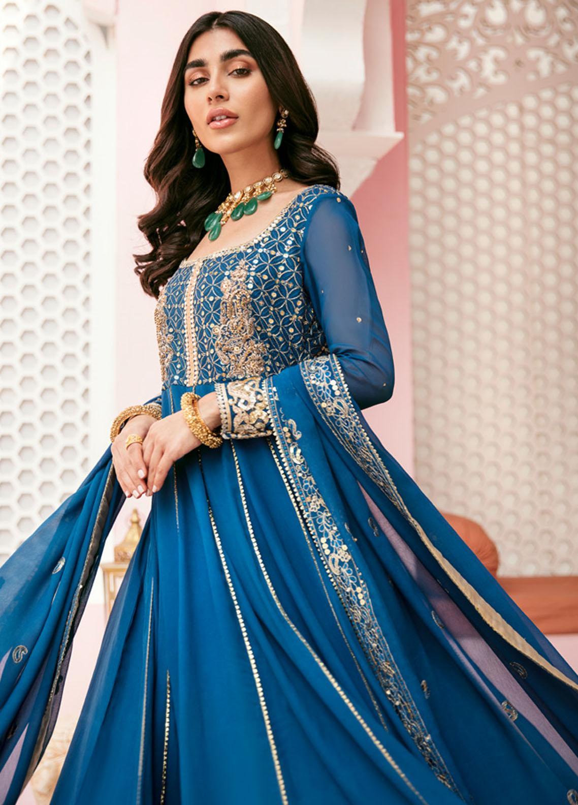 Luxury Pret 3 Piece Wedding Dress-Royal blue gown is an epitome of elegance. The bodice features intricate handwork using sequins, thereadwork & copper motifs. The simplicity of this ensemble is what makes it stand out. It is paired with an embroidered tilla and thread work dupatta adorned with motive spray.