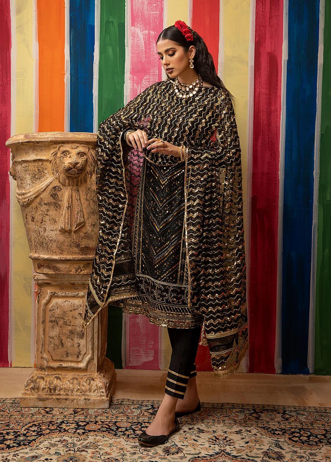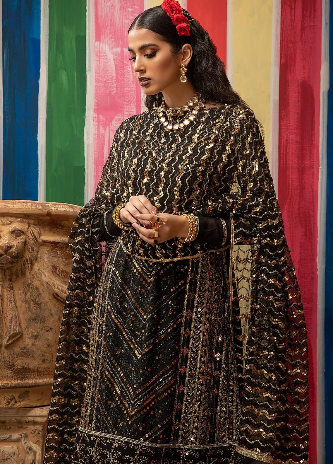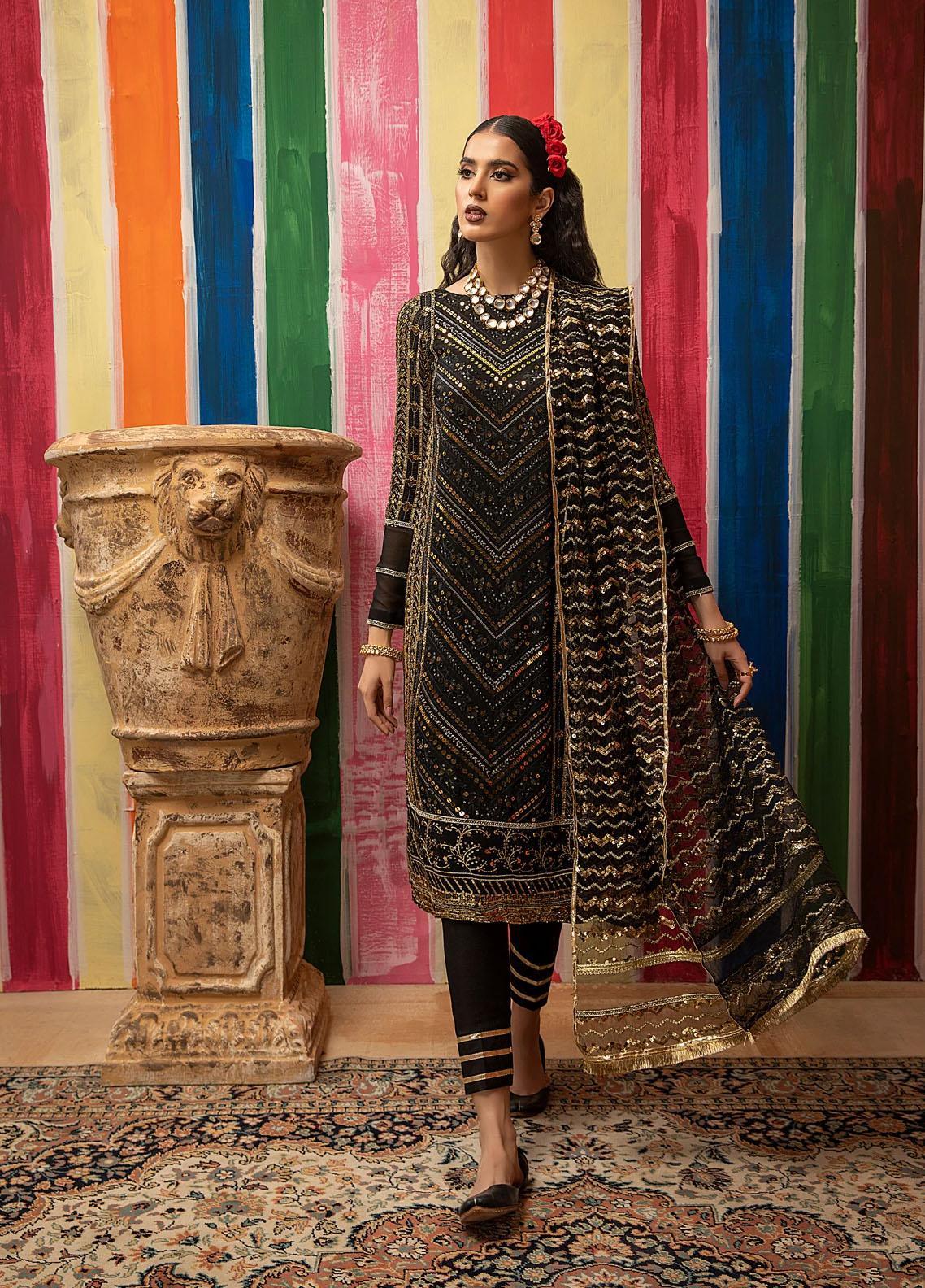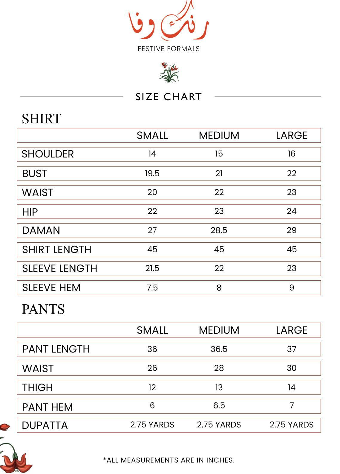 A regal and absolutely timeless blend of chiffon fabric with sequins and gold tilla-work. Paired with heavily embellished sleeves, sequin and tilla-work dupatta and ornamental cigarette pants, this ensemble is a timeless classic