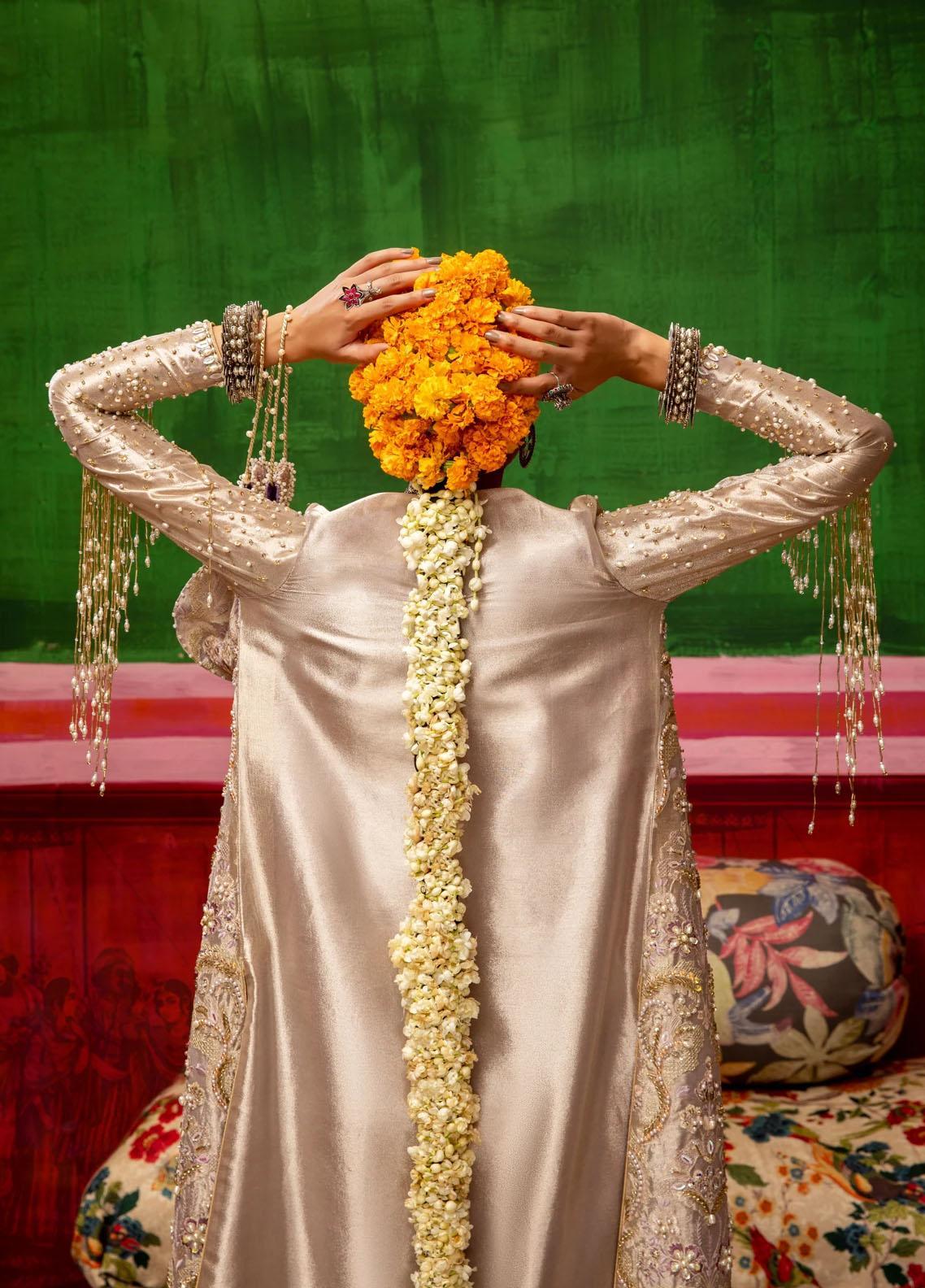A lavender tissue jacket intricately adorned with zari and pearl work, paired with a coordinated lilac raw silk slip and cigarette pants