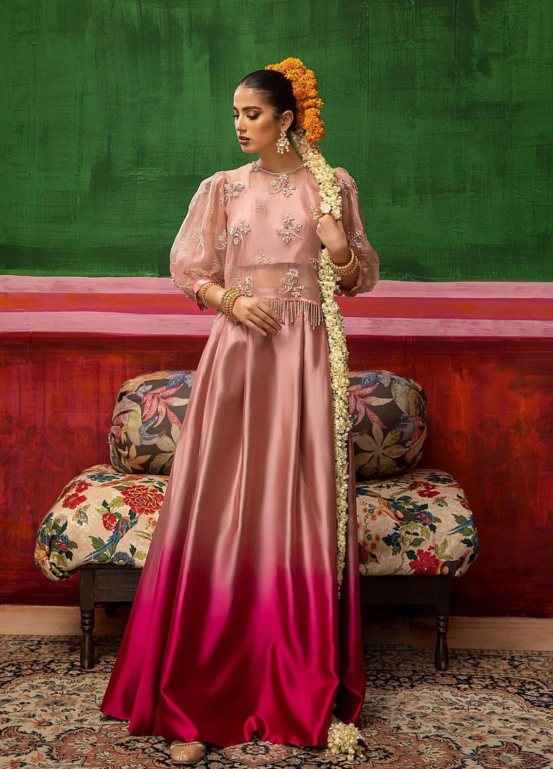 A sheer hand-embellished rose organza top, adorned with zari and dabka work, featuring regal Swarovski crystal tassels. Paired elegantly with a cropped rose raw silk slip and ombre fuchsia lehenga. The beauty of this ensemble relies on the fluidity of its one of a kind silhouette