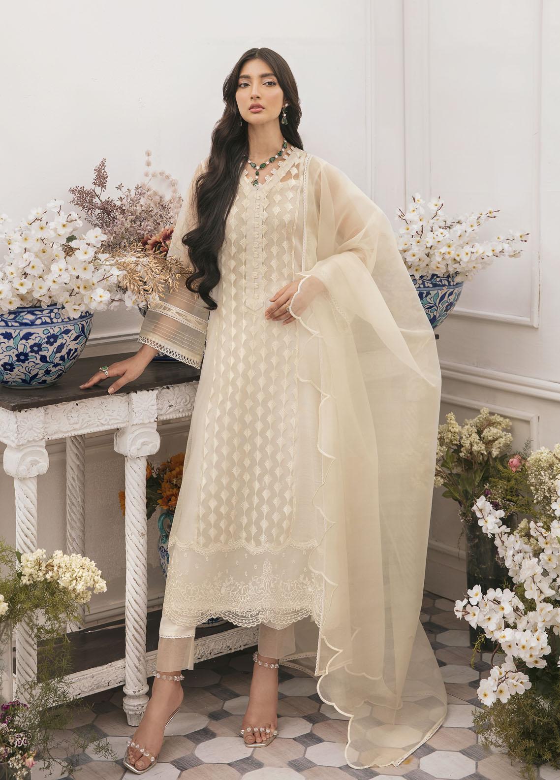 A classic ivory five panelled A line shirt beautifully made in organza and cotton net.The shirt has beautiful border and stitching , and is paired with straight pants. The organza dupatta has beautiful hand cut scallop .