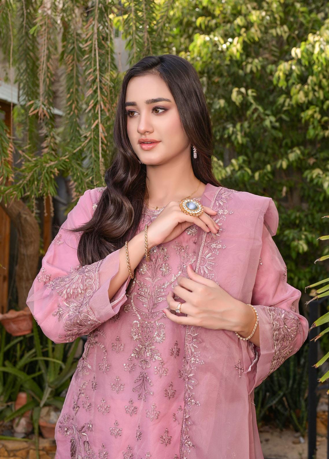 Embody elegance this Eid in this luxury stitched three piece ensemble, featuring a sequence embroidered pink organza shirt, masoori trouser and a same-coloured bud sequence embroidered dupatta.