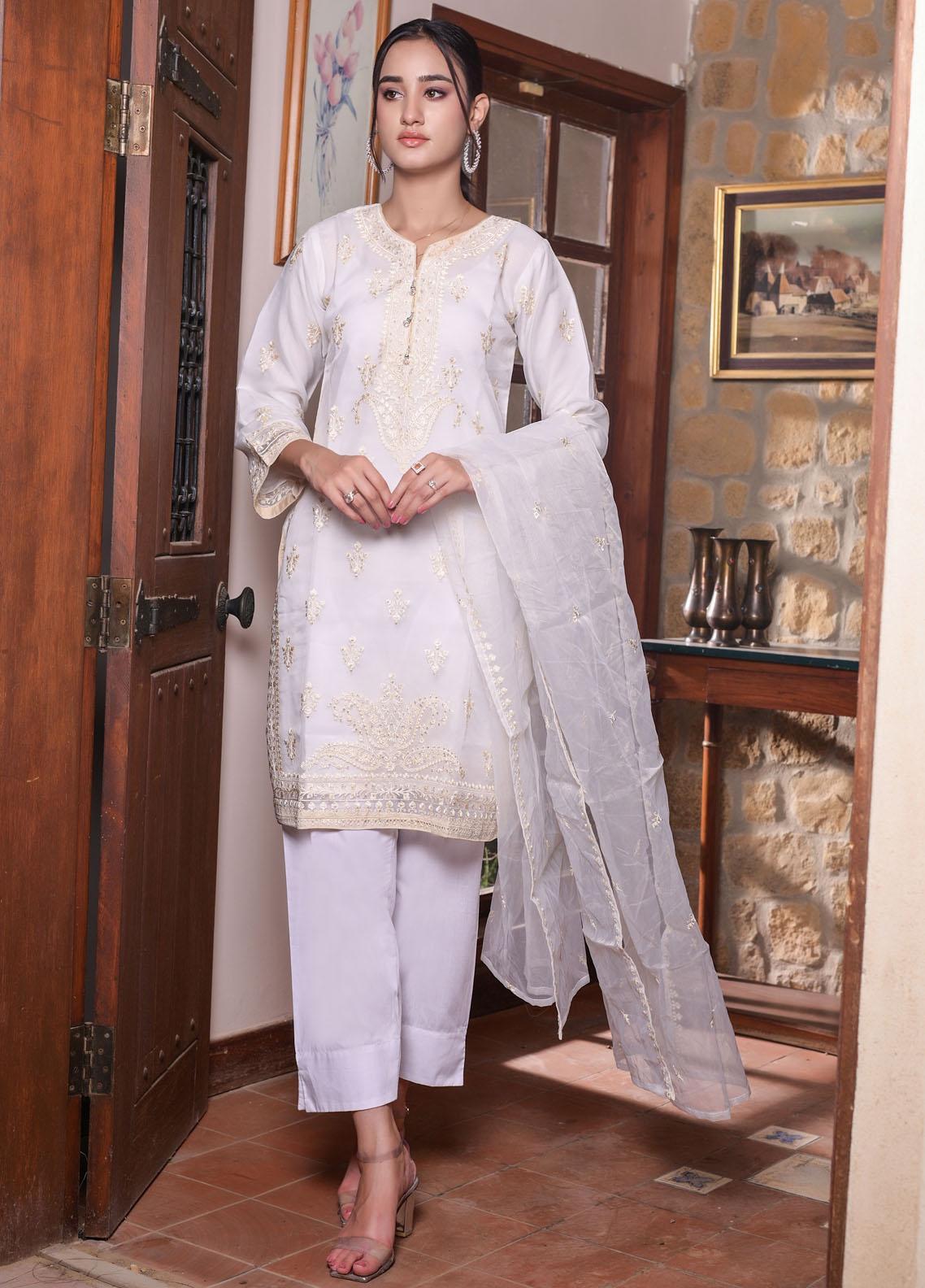 Embrace the rich hues of this white luxury formal stitched three piece ensemble featuring an cream sequence embroidered organza shirt, cotton trousers, and a organza dupatta with cream sequence buds embroidery.