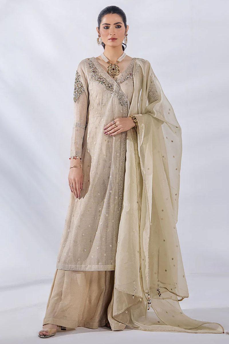This is a 4 piece stitched outfit shirt trousers dupatta and camisole.Sure to be classic this Eid. An irresistible design which is composed with stunning motifs and embroidery. The angrakha is generously hand embellished with zardozi work decorated with sequins and stones. The angrakha is paired with trousers and an embroidered organza dupatta._x005F