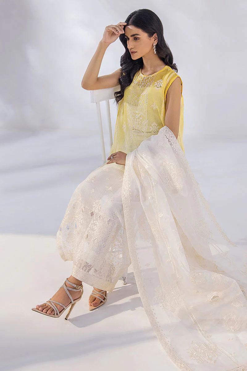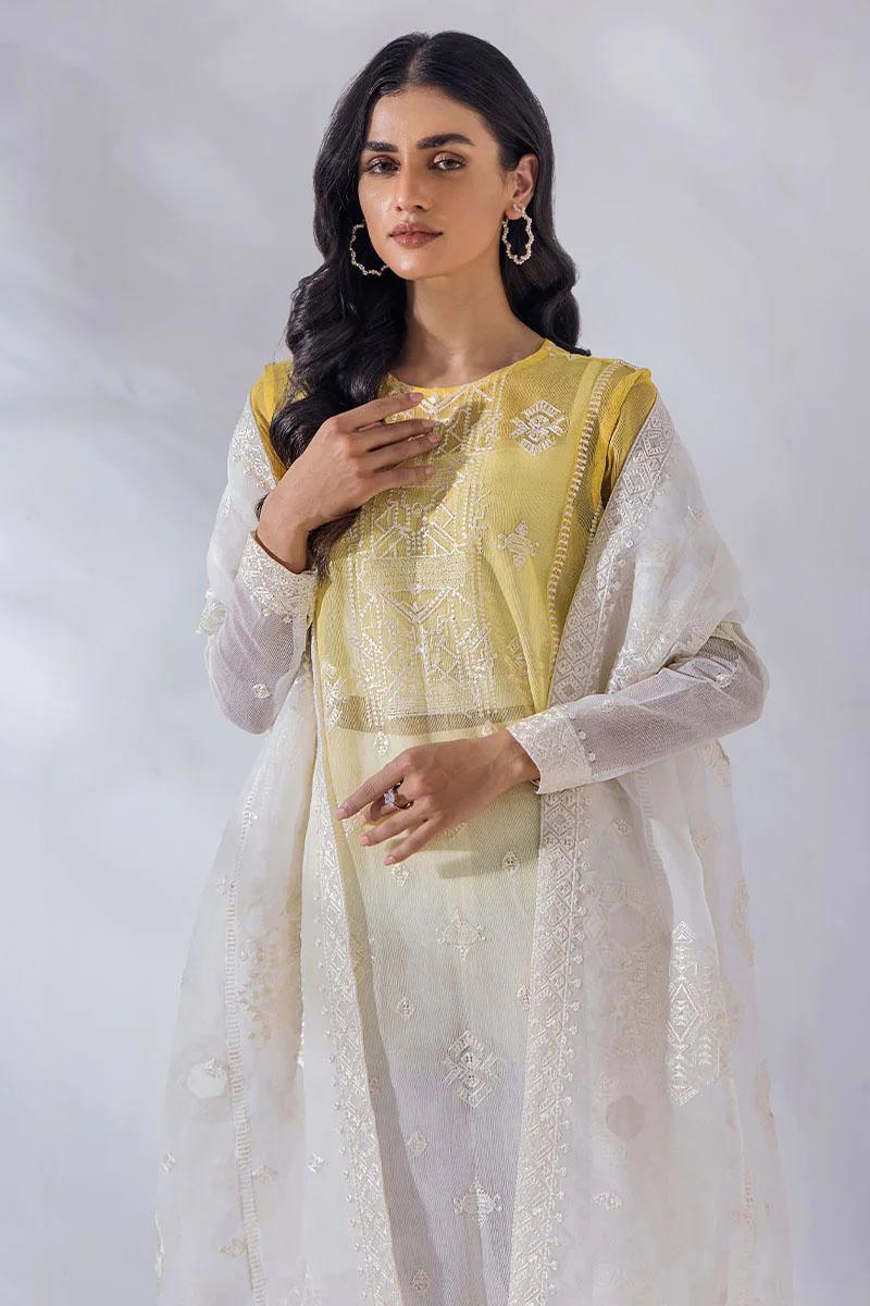 This is a 4 piece stitched outfit shirt trousers dupatta and inner camisole.Look ravishing in this yellow ombre khadi net shirt. The shirt features matching front panels generously embroidered with amazing modern architecture motifs. It is paired with cigarette pants and a classic fully embroidered and cutwork dupatta. The droplet hangings in the dupatta add oomph to this statement._x005F