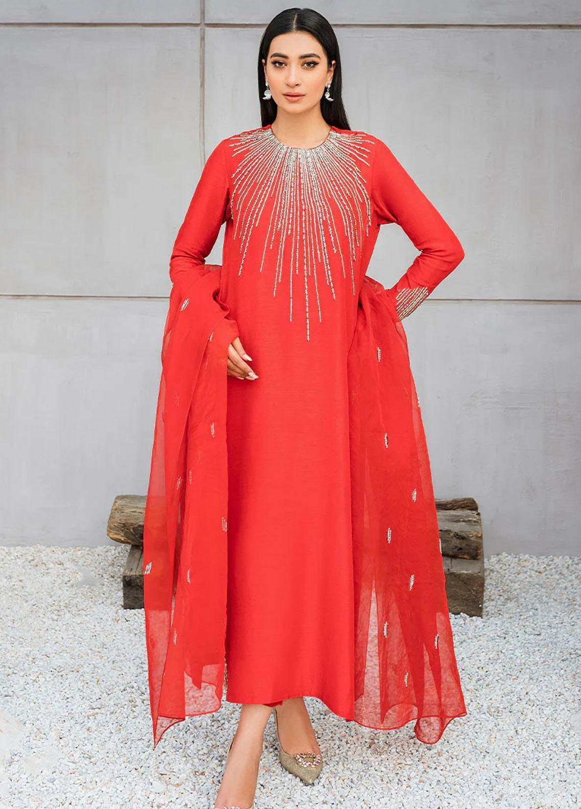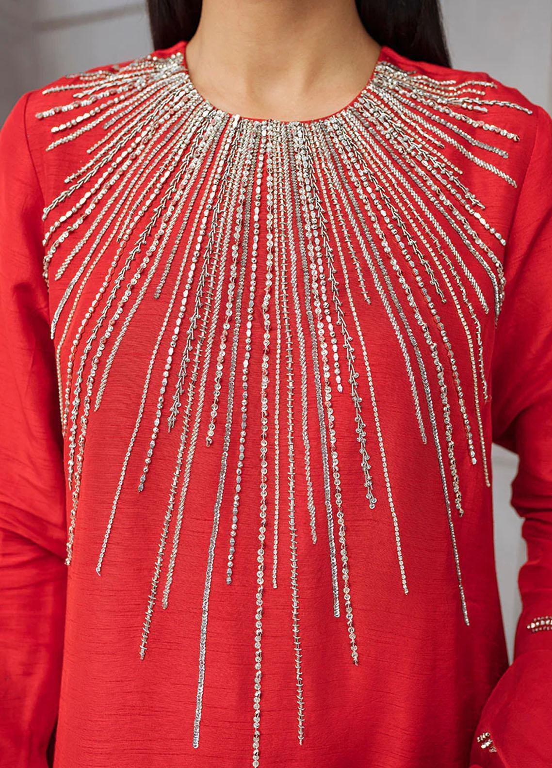 This is a 3 piece stitched outfit Shirt Trouser and Dupatta.In an elegant ode to tradition a raw silk long modern cut shirt hand worked with appealing and sparkling embellishments. Nawal is a long red shirt with embellished rays at neckline and sleeves. The long shirt is paired with trouser and hand embellished organza dupatta. It is a statement piece that is bound to turn heads at an evening soiree.