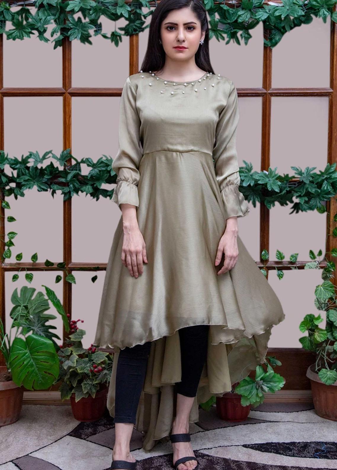 Size worn by model: Small Suit: 1 piece Fabric: Crinkle silk Detailing: Captivating midi dress astonished with pearls on neckline and belt, frills on sleeves, motif on body and the ravishing flare makes it a gorgeous ensemble for parties Color options: Peach, Royal Blue, Sea green, Red and Purple