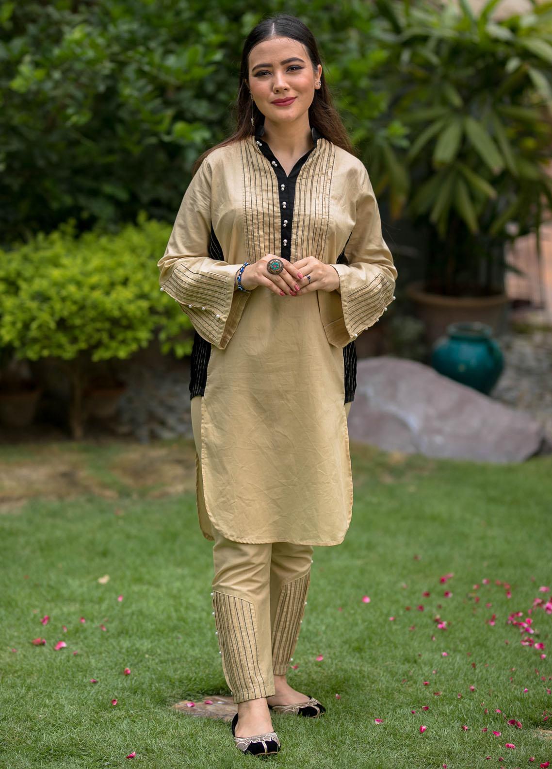 Size worn by model: Small Suit: 2 piece Fabric: Cotton Detailing: Straight shirt with side seam panel detailed with pleats, detailing with pearls and pin-tuck on neckline, sleeves and trouser. Color options: Pink and Beige