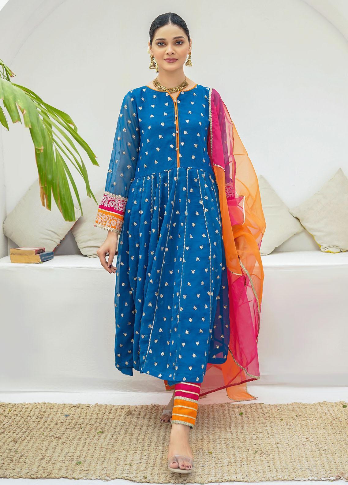 3 Piece Embroidered Chiffon Suit Make a statement in this vibrant green Anarkali dress, featuring a beautiful embroidery essence and delicate detailing on the neckline and trousers, and comes with a contrast organza dupatta.