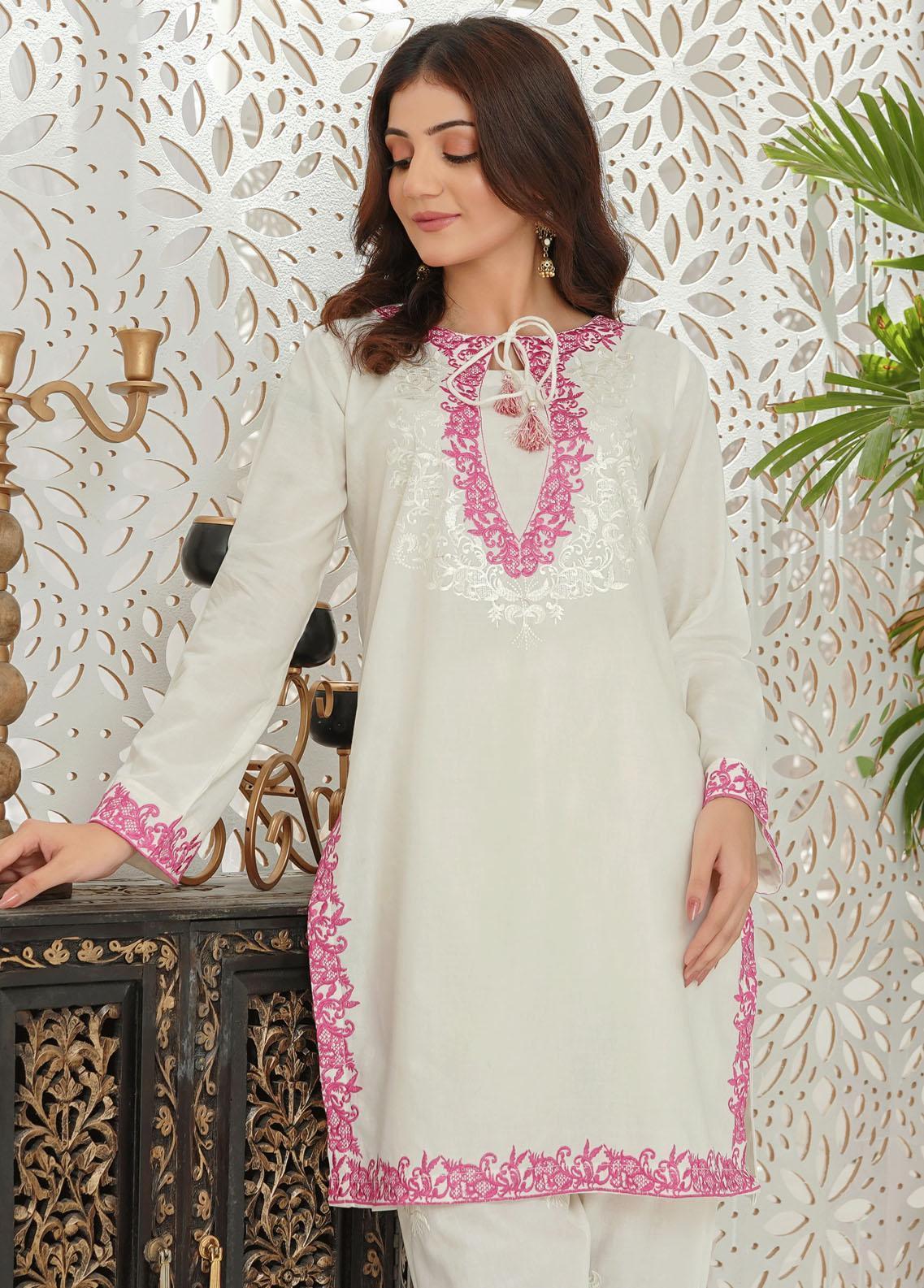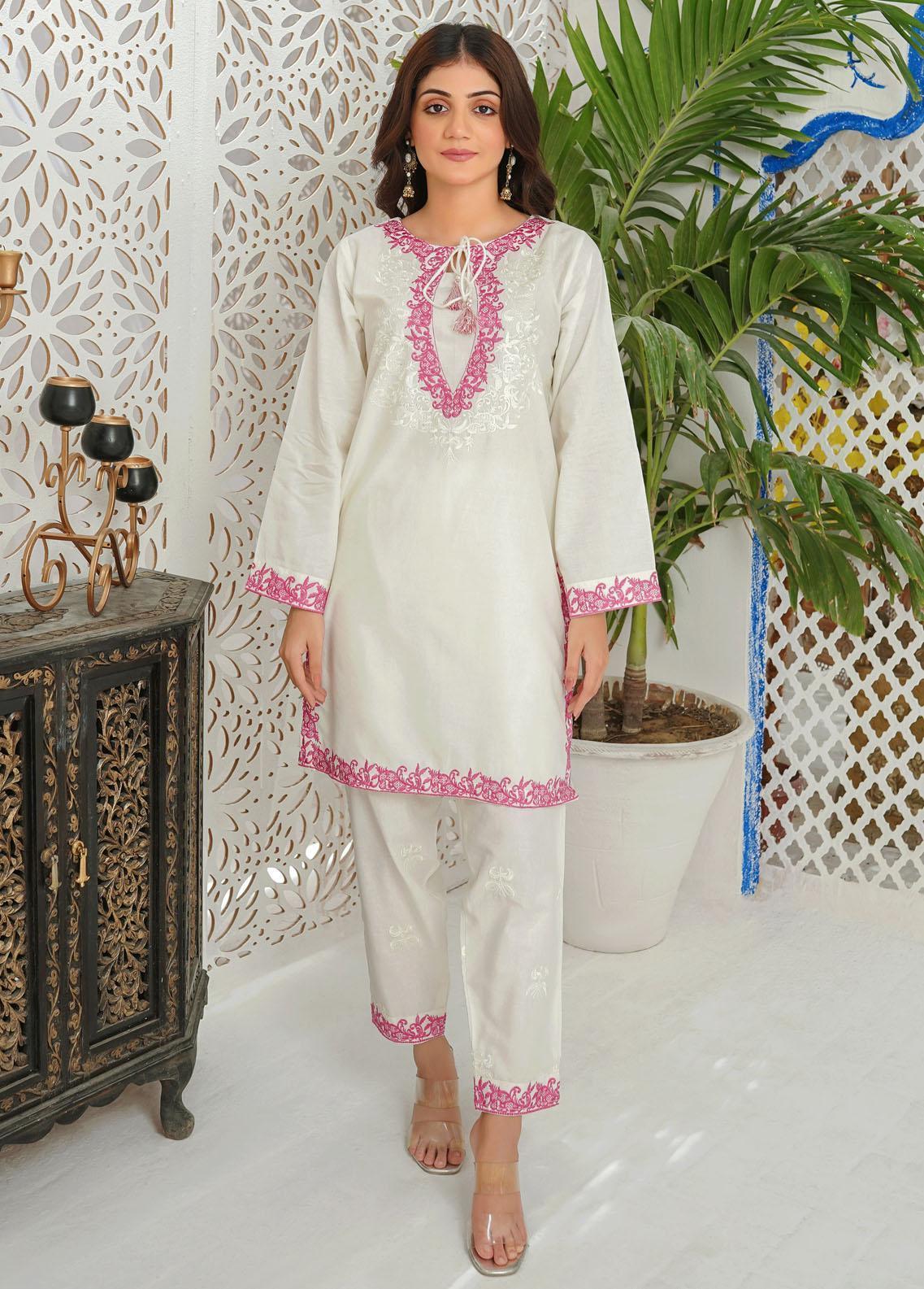 2 Piece Embroidered Cotton Suit Stunning Cotton 2-piece set is embellished with matching floral tread work. The shirt is designed with a modern cut and comes with matching pants, making it a perfect outfit for any event.