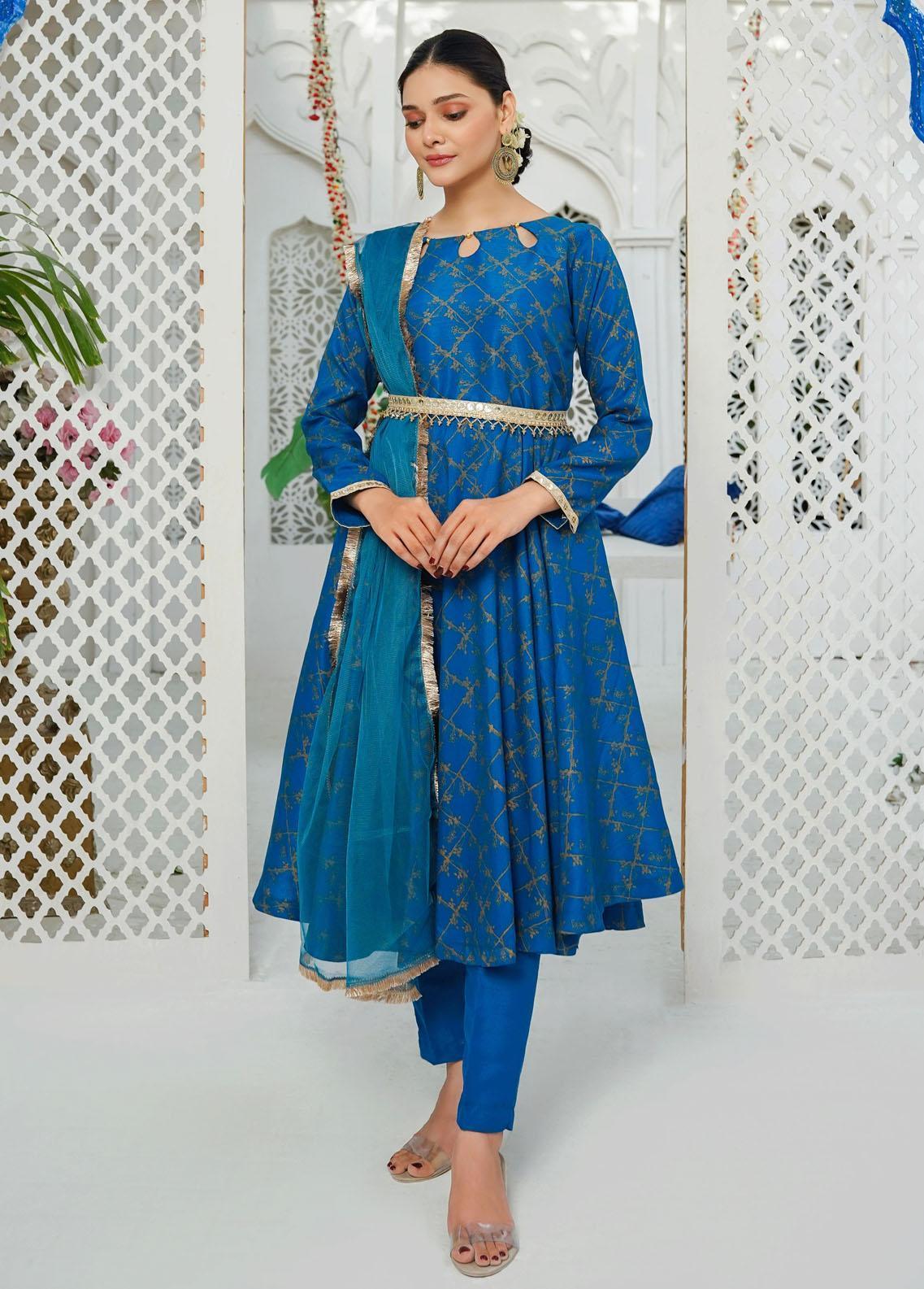 3 Piece Embroidered Raw Silk Suit The bodice and sleeves of this stunning teal Anarkali dress have elaborate gold embroidery which gives the dress a regal appearance. it is constructed of pure raw silk fabric.