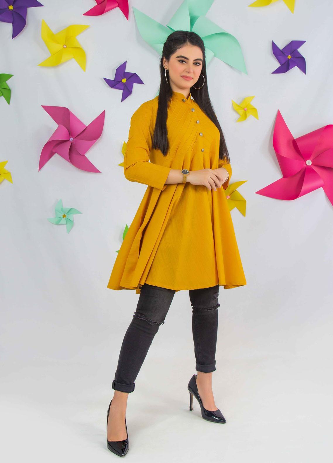 Size worn by model: Small Suit: 1 piece Fabric: Khaddar Detailing: Astonishing khaddar kurta with frilled style and body with pintex gives it a perfect touch of fashion glory Color options: Mustard and Gray