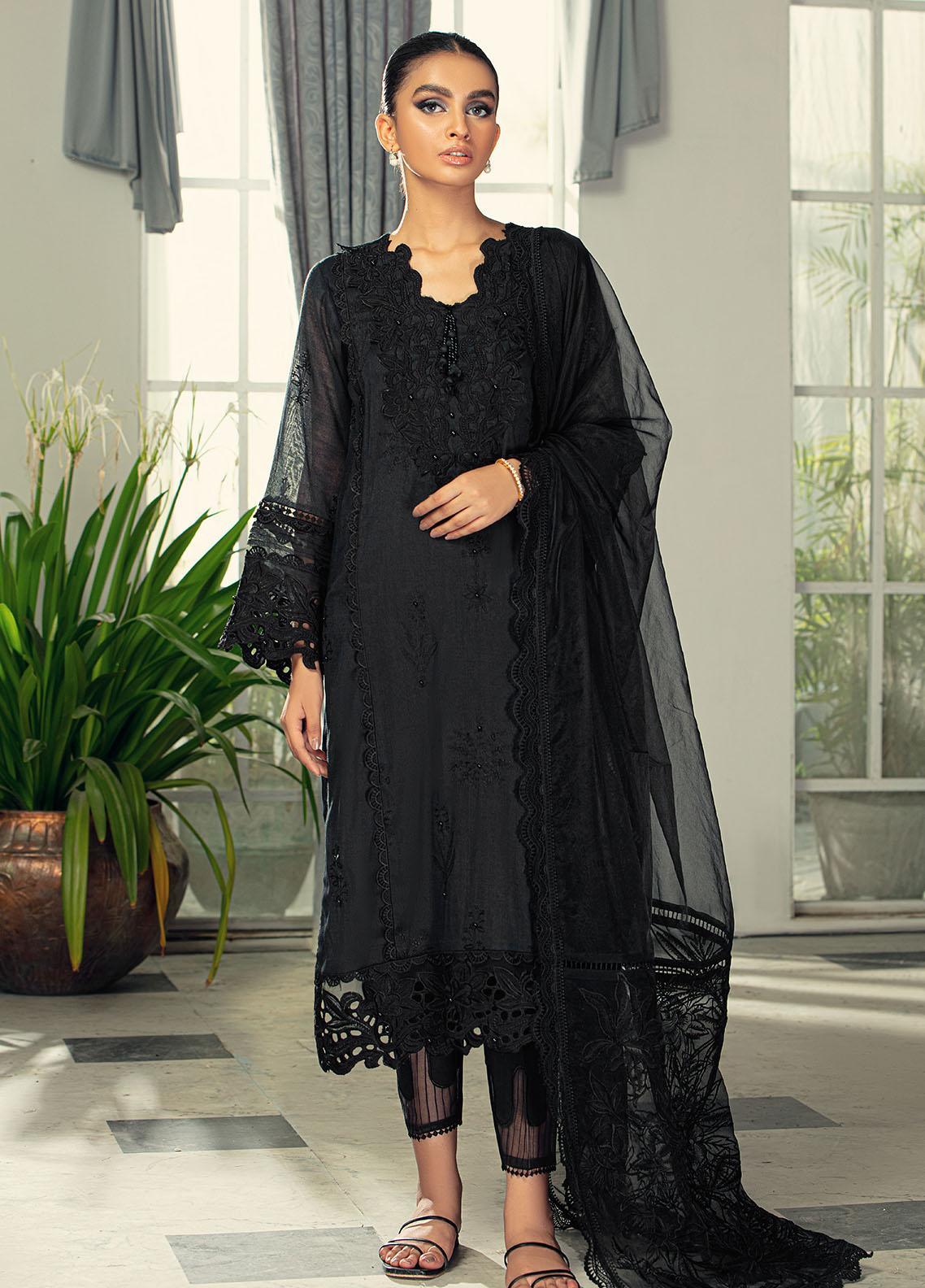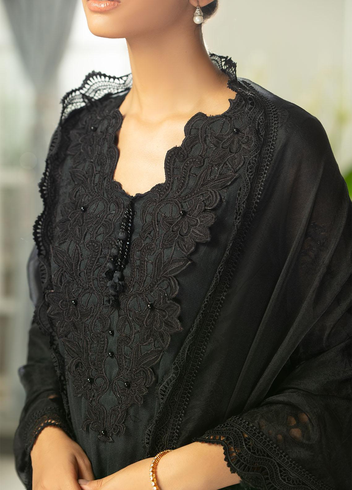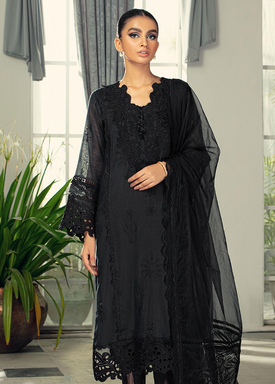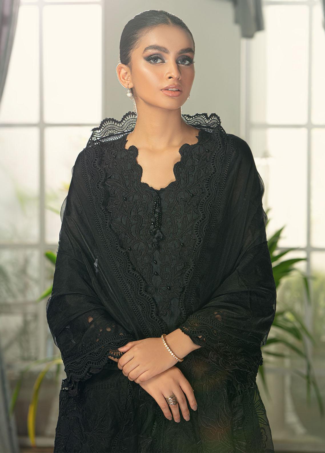 Set on a pure khaddi ebony cotton net base is our next design, Maya. Intricately embroidered and lightly embellished shirt is finished with a lazer cut border on the hemline and sleeves. It is paired with a monotone pure organza dupata with embroidered borders.