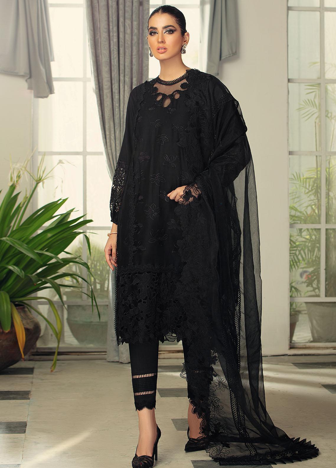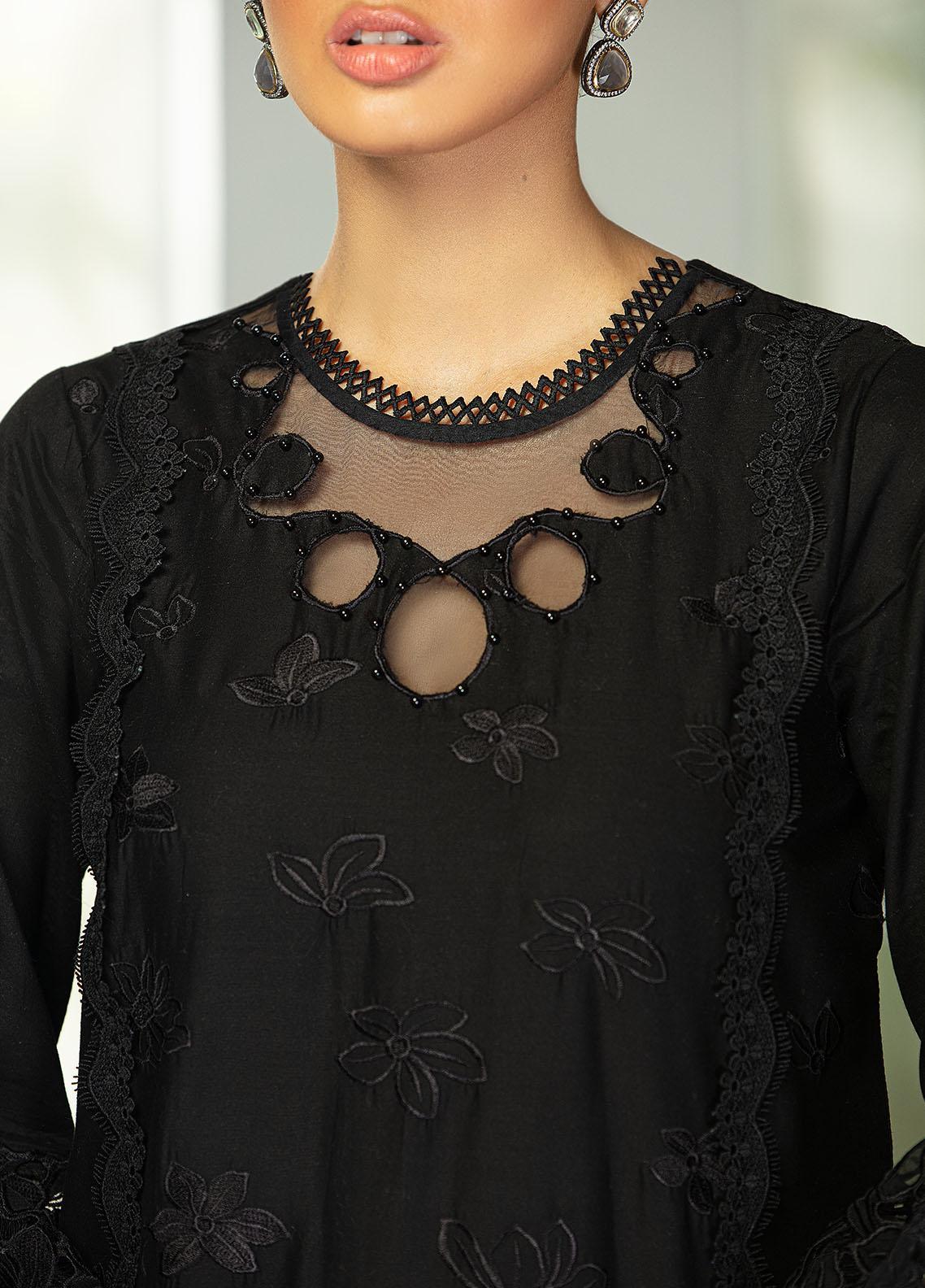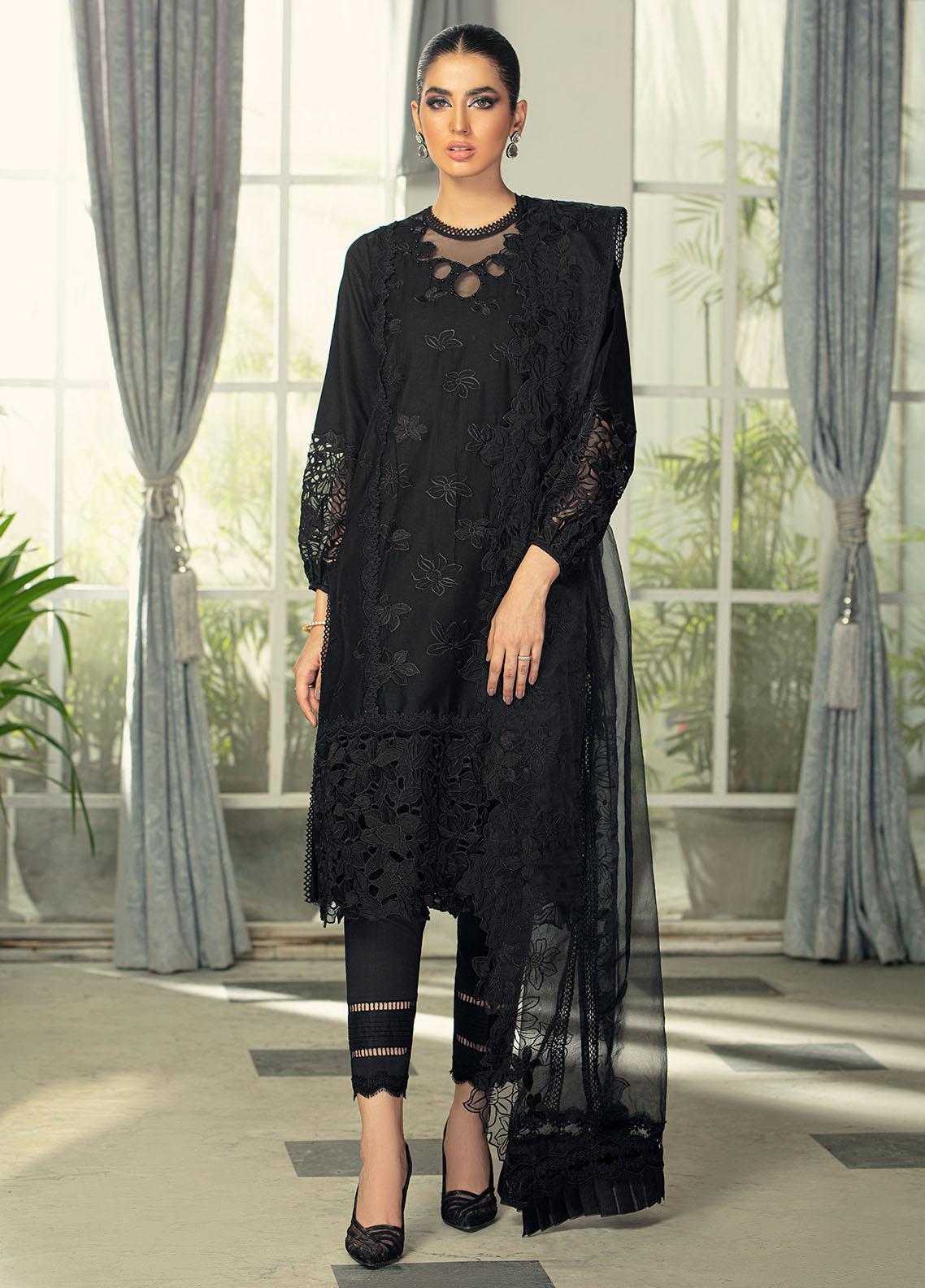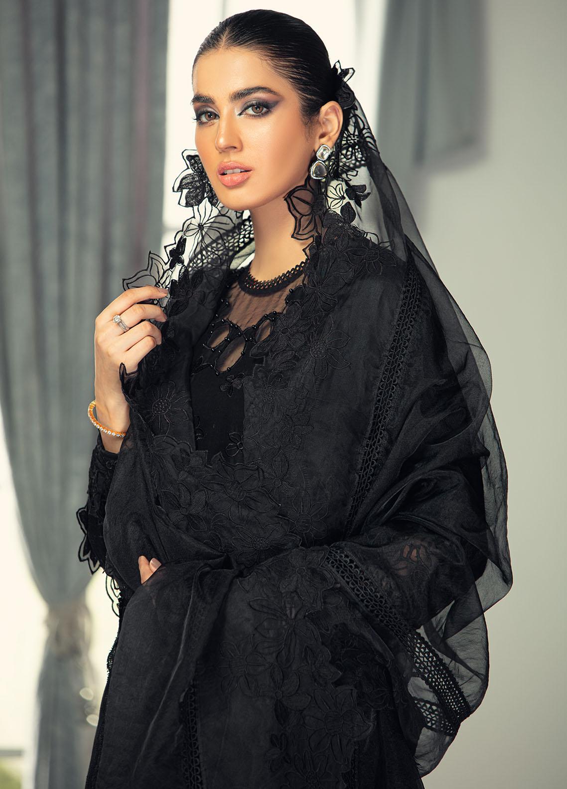 Black beauty' is set on airy lawn with lazer cut details on the sleeves and hemline. The highlight of this design is the stunning floral scalloped pure organza dupata with lace finishings.