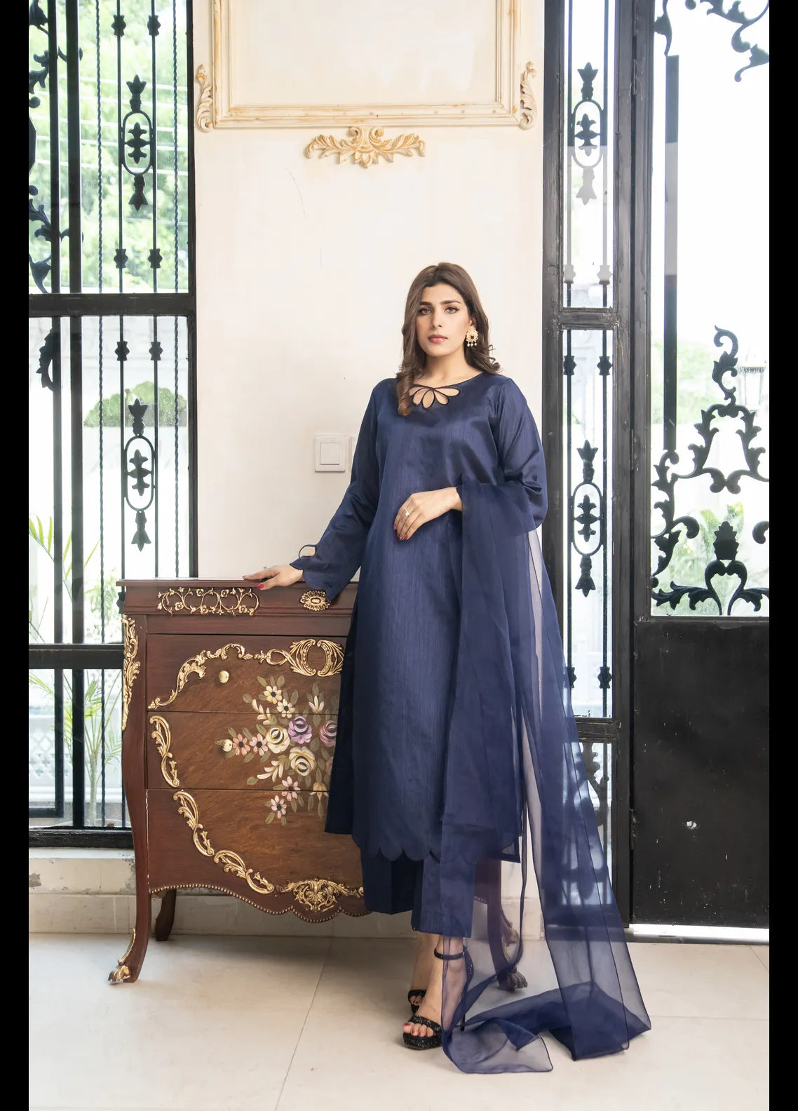 Naaz Couture Embroidered Pret Raw Silk 3 Piece Suit Navy Blue