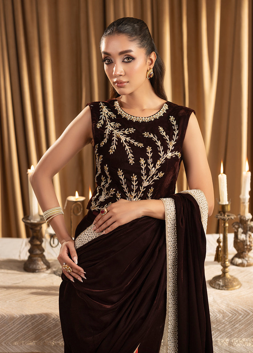 Chocolate hued saree with silky zarri pleats, adorned with dazzling silver pearls work on pallu and light gold adda work on blouse. A fusion of luxe velvet and shimmery silk zarri that's totally Saree Goals for a sophisticated, head-turning look.