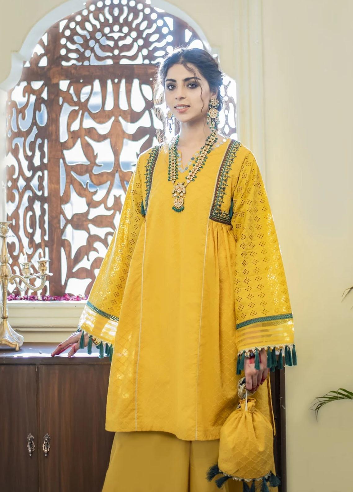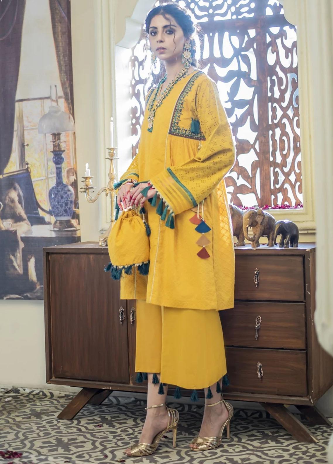 Striking mustard chickenkaari outfit with trousers and intricately embroidered neckline and shoulders. 2 Piece (Shirt + Trouser) -Shirt (Chickenkari with boring sleeves)-Trouser (Lawn)
