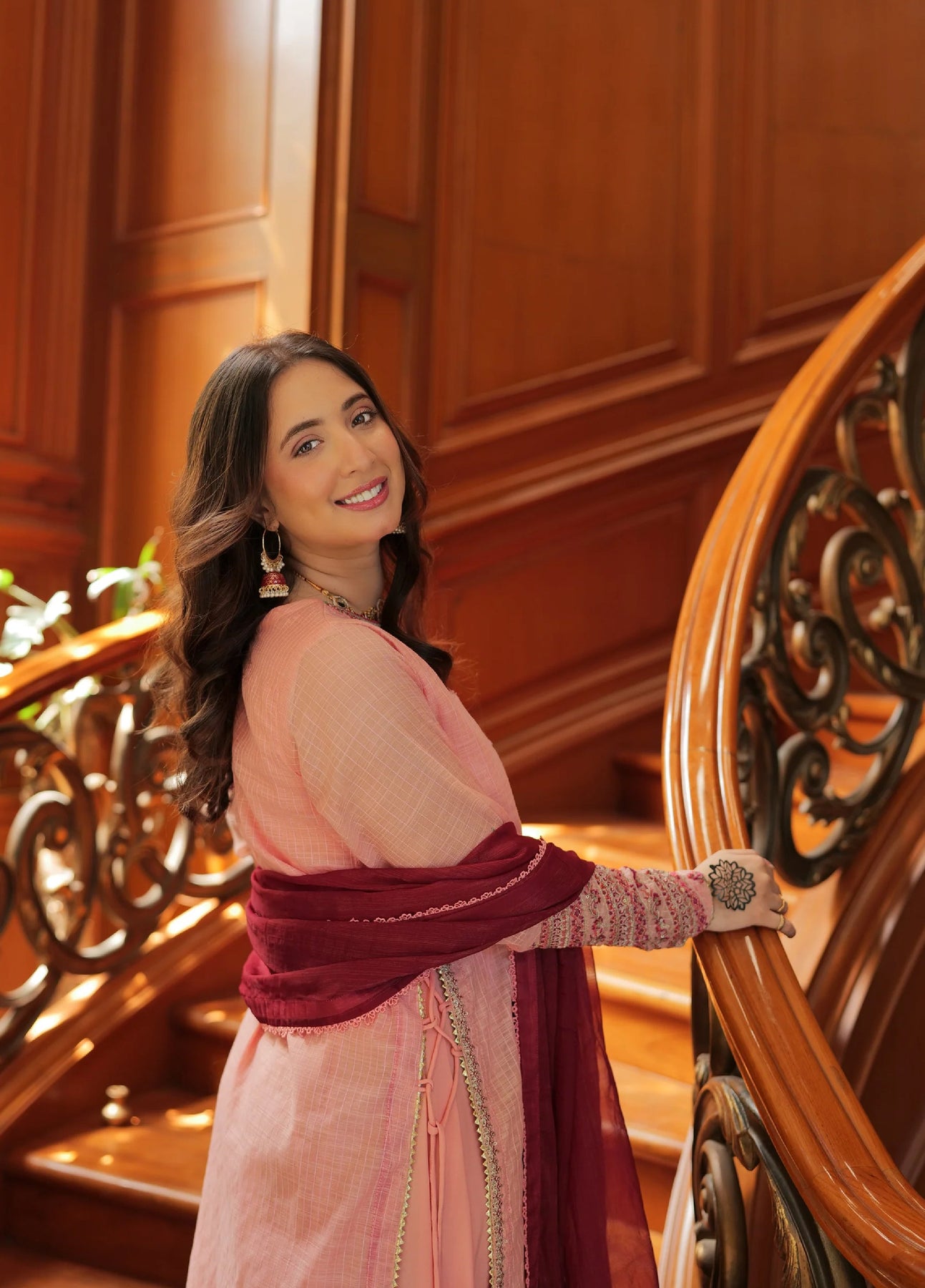 Color: Peach Fabric of shirt: Munar line Fabric of dupatta: Maysuri Model Height: The model is 5'5 and wears a small size.