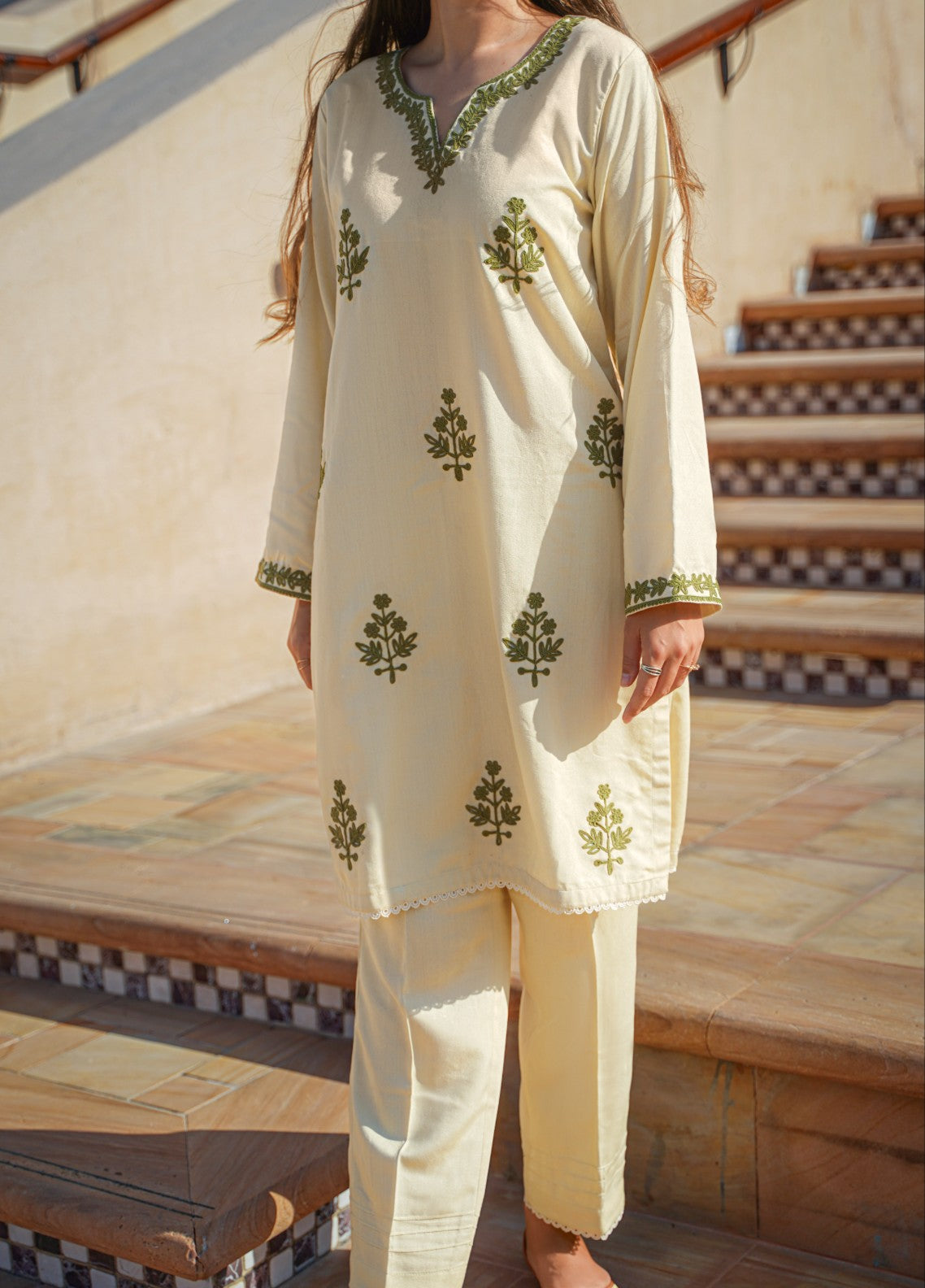 This elegant beige piece features intricate green dorri embroidery that flows beautifully across the fabric, enhanced by a delicate lace finishing. A perfect blend of sophistication and charm, adding a timeless touch to any wardrobe.