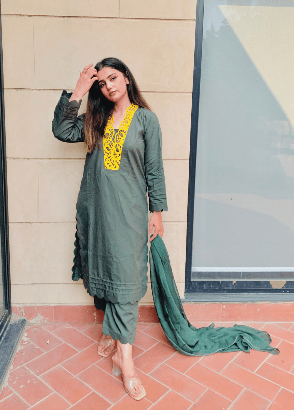 Beautiful Shirt Design: The kameez features a V-shaped neckline with vibrant yellow embroidery, intricate cutwork, and scalloped edges for added charm.