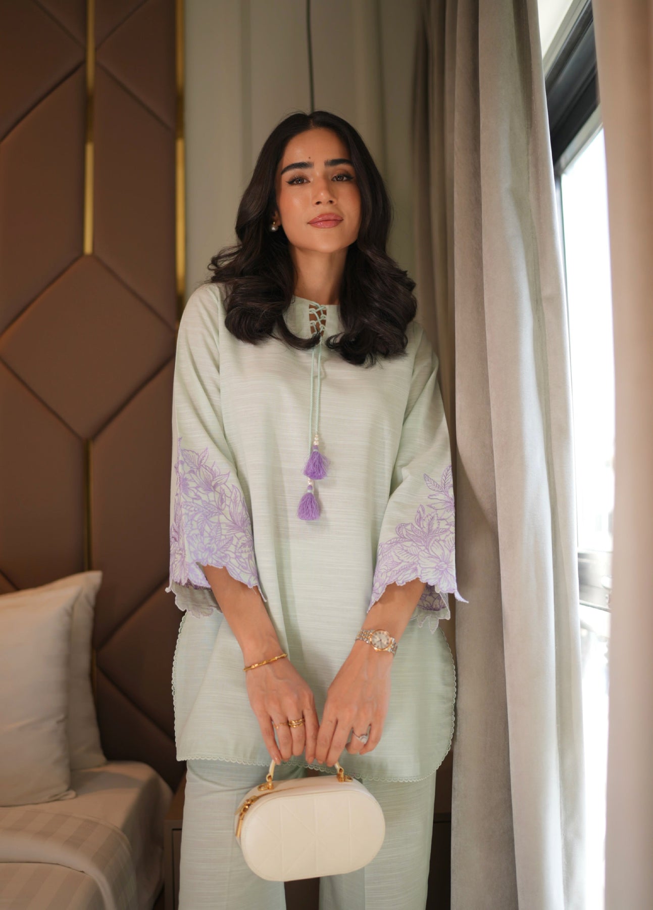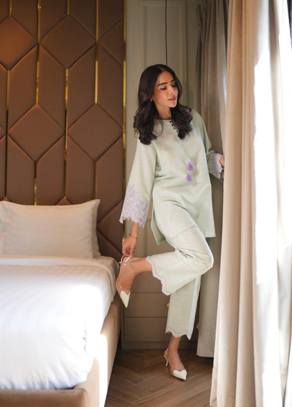 An ethereal mint co-ord set adorned with soft lilac lace detailing on flared sleeves and a dainty lace-trimmed neckline. The shirt’s minimal silhouette exudes understated elegance, while the straight-cut trousers feature delicate lace inserts along the hem, adding a graceful feminine finish.