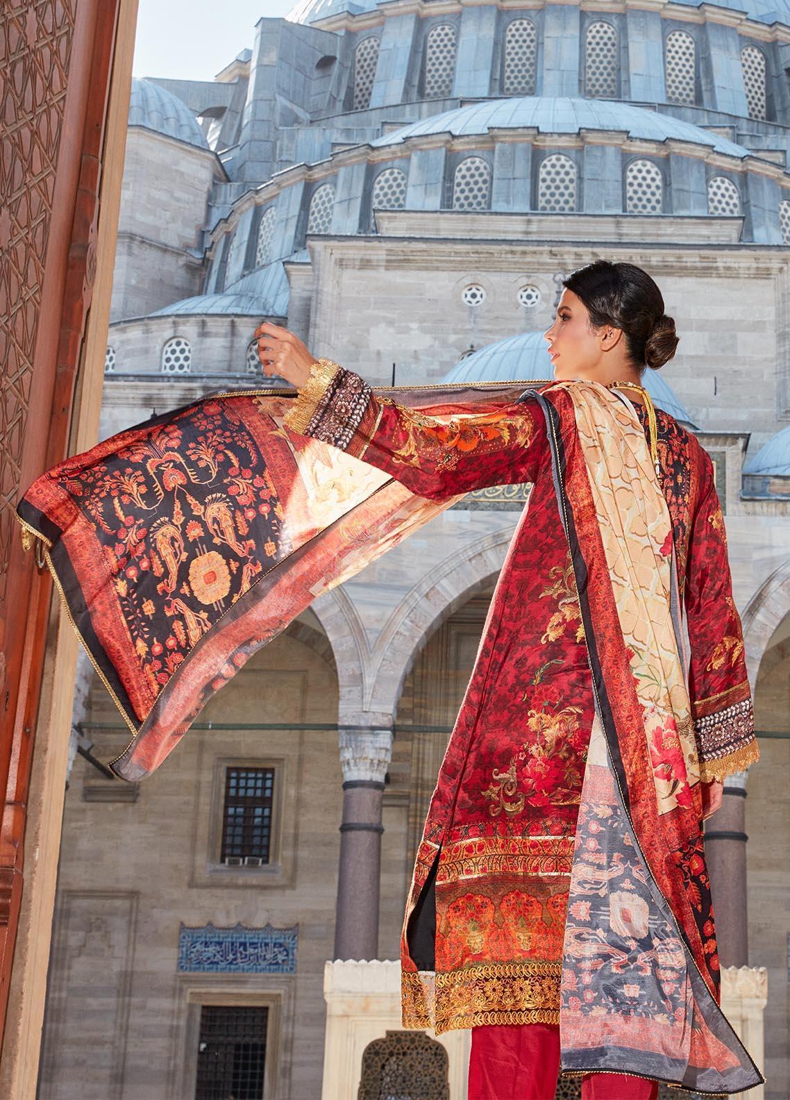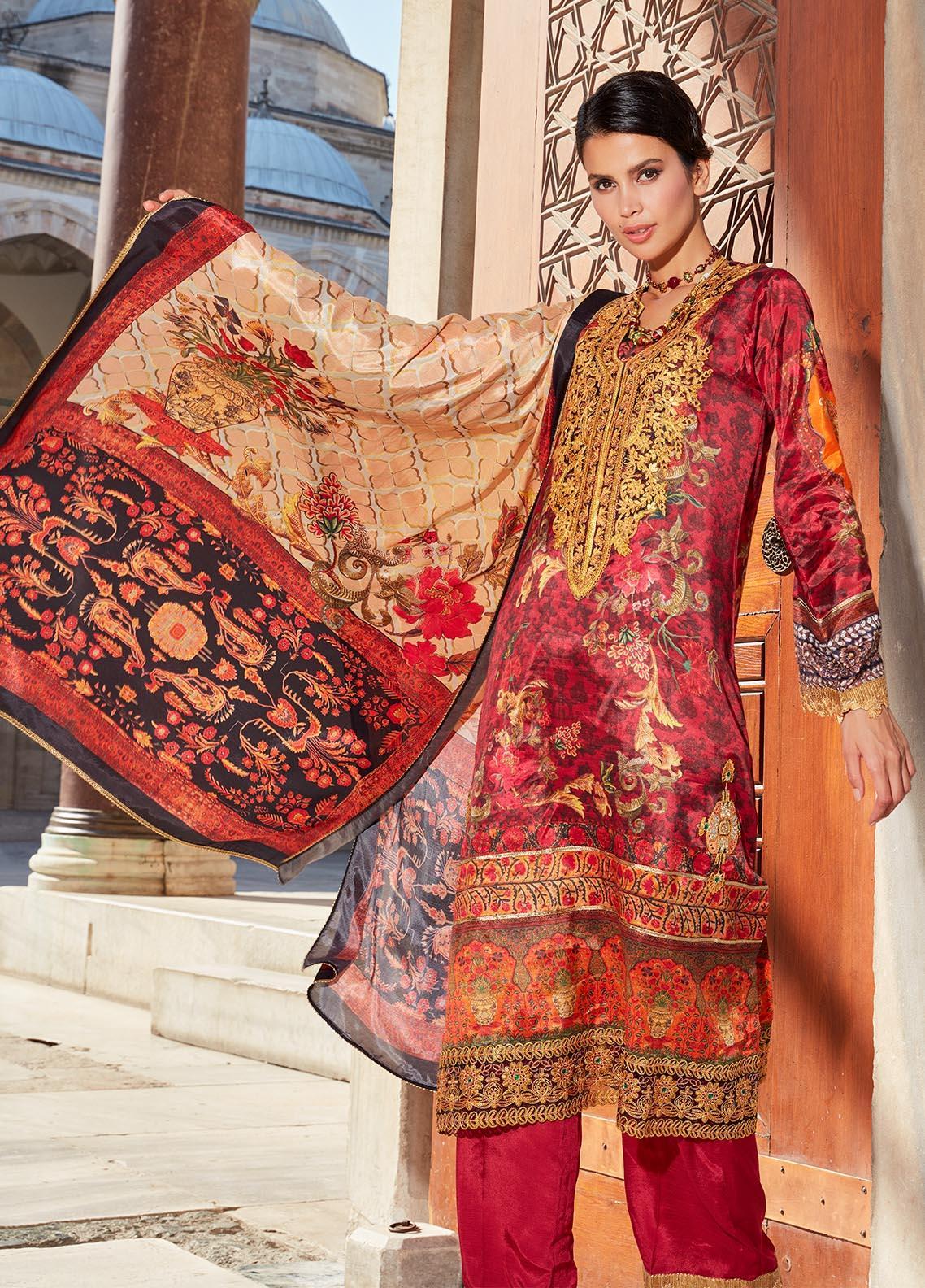 An exquisitely designed shirt with prints and patterns reflecting our heritage in opulent colors of royalty. Featuring majestic embroidery motifs with hand worked naqshi, betki, stones and SEQUINS for shirt and dupatta borders, sleeves and daaman makes this outfit stand out