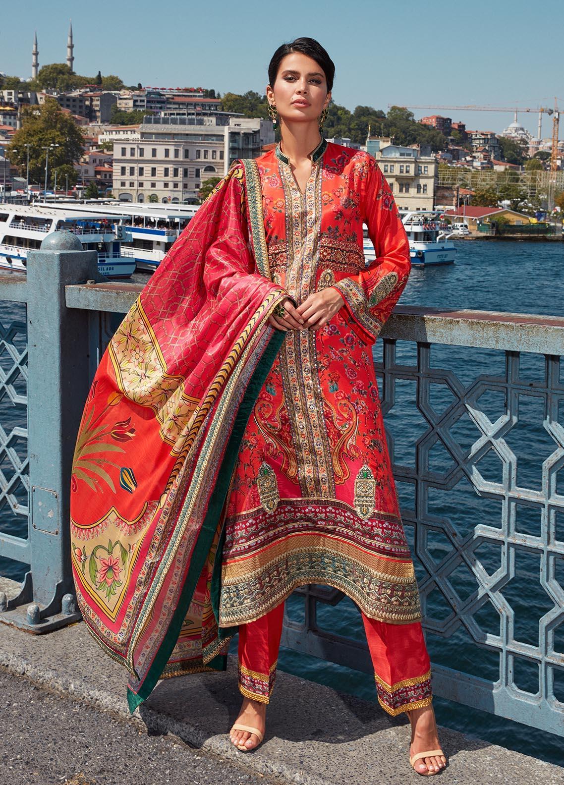 Wear this one of a kind ensemble inspired by Ottoman design and cut with beautiful detailing in emerald green hand worked motifs and gold on an Orient flame coloured shirt. Coupled with matching pants and a finely crafted dupatta to complete this stunning look
