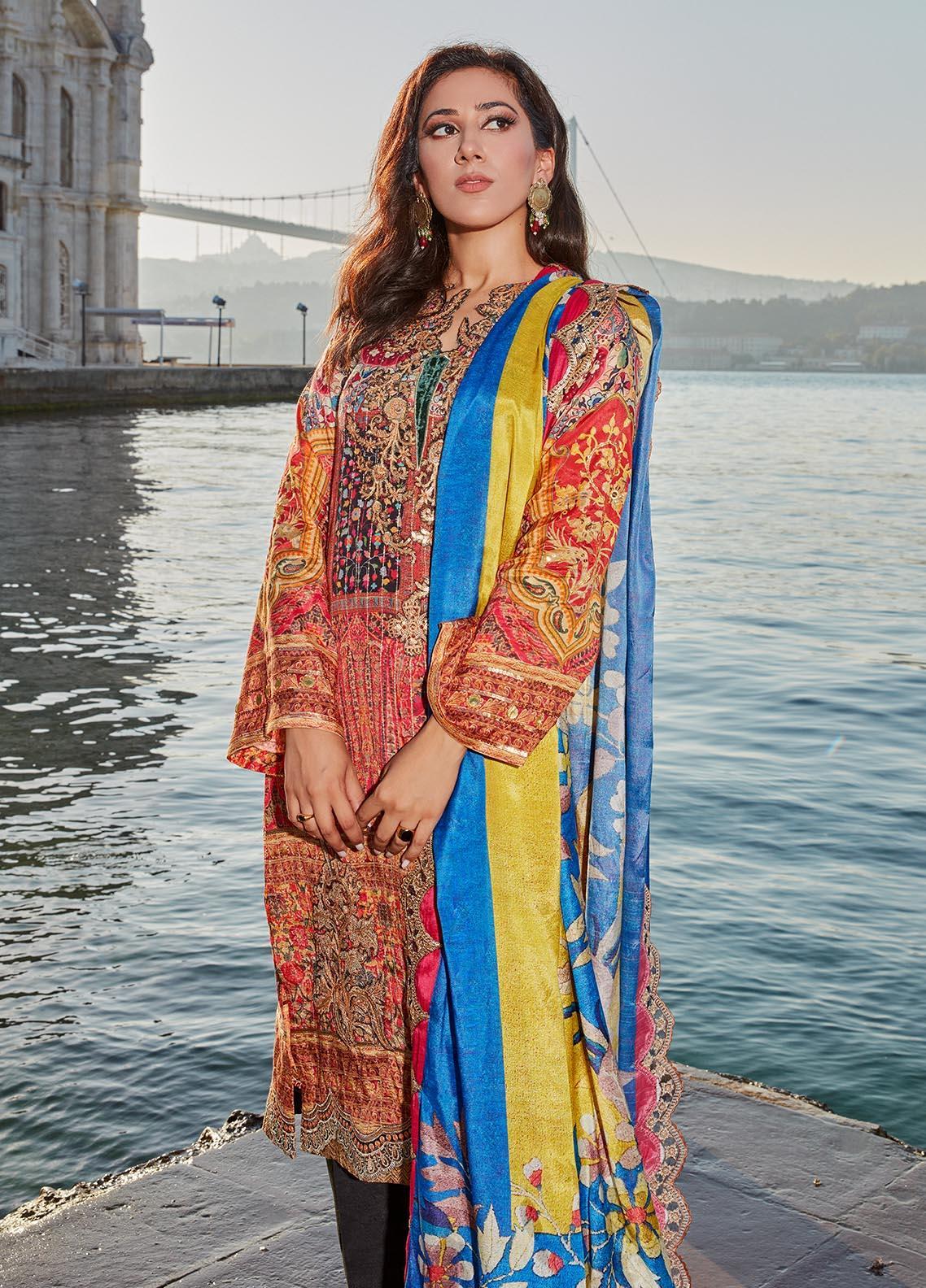 Flawless Kashmiri shawl inspired ensemble with intricately patterned paisleys in shades of salmon and feminine pinks, blues and purples. Featuring a jamawar border and SEQUINS with running tilla and gota embroidery. Coupled with a gorgeous printed dupatta with scalloped border and matching pants
