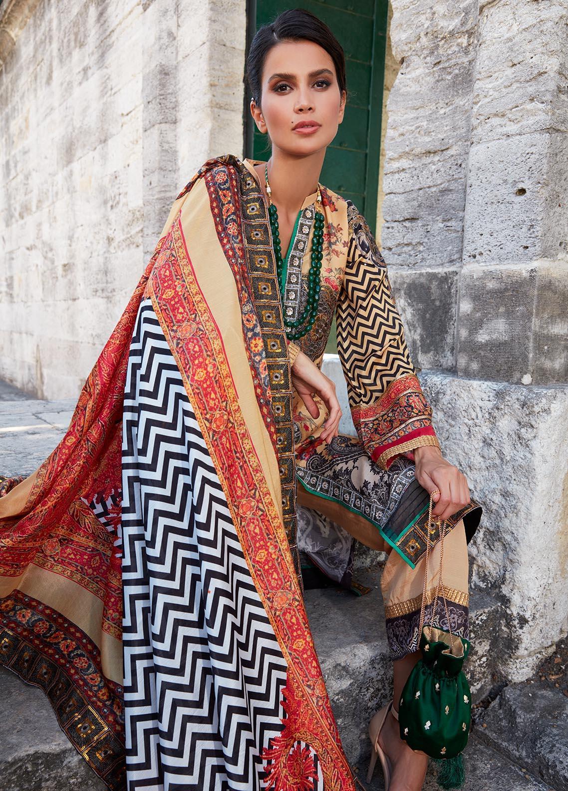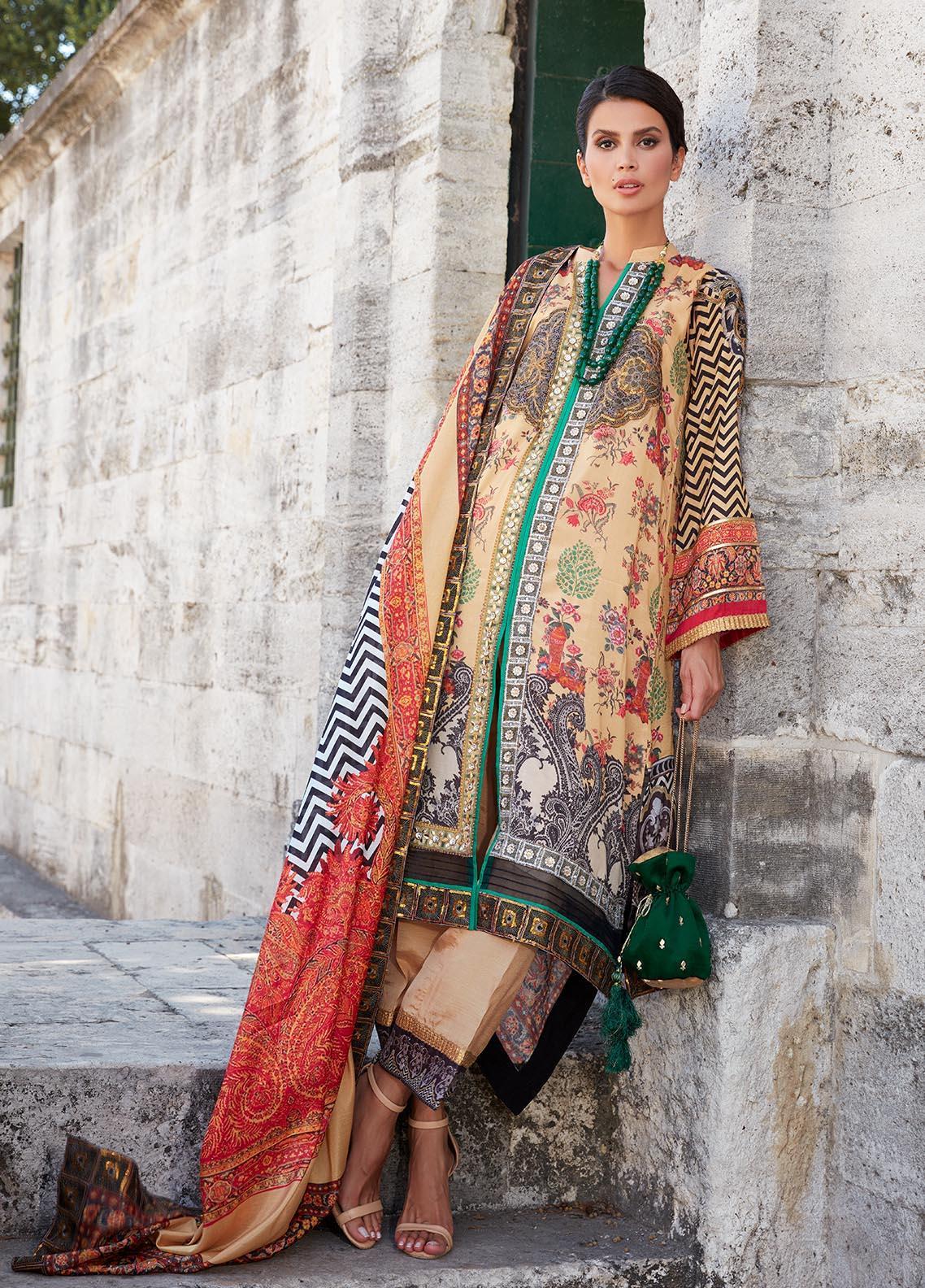 An orient inspired piece of art breathes understated regality in shades of vibrant orange, green and cream with vivid magenta daman. Featuring organza embroidered borders, gota and golden lace along with tila and sitara hand work. Finished with a fabulous contrasting dupatta and raven pants